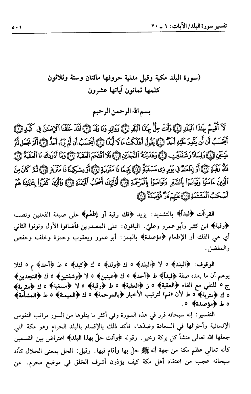 الْبَلَدِ هـ لا الْبَلَدِ هـ ك وَلَدَ هـ ك كَبَدٍ هـ ط أَحَدٌ م هـ لئلا يوهم أن ما بعده صفة لُبَداً ط أَحَدٌ هـ ك عَيْنَيْنِ هـ لا وَشَفَتَيْنِ هـ ك النَّجْدَيْنِ ج هـ للنفي مع الفاء الْعَقَبَةَ هـ ز الْعَقَبَةُ هـ ط رَقَبَةٍ هـ لا مَسْغَبَةٍ هـ ك مَقْرَبَةٍ هـ ك مَتْرَبَةٍ هـ ط لأن «ثم» لترتيب الأخبار بِالْمَرْحَمَةِ هـ ك الْمَيْمَنَةِ هـ ط الْمَشْأَمَةِ هـ ط مُؤْصَدَةٌ هـ.