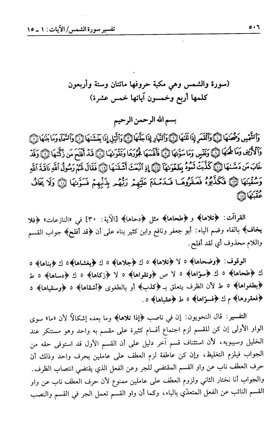 وَضُحاها هـ لا تَلاها هـ ك جَلَّاها هـ ك يَغْشاها هـ ك بَناها هـ ك طَحاها هـ ك سَوَّاها هـ لا ص وَتَقْواها هـ لا زَكَّاها هـ ك دَسَّاها هـ ط بِطَغْواها هـ ط لأن الظرف يتعلق ب كَذَّبَتْ أو بالطغوى أَشْقاها هـ وَسُقْياها هـ فَعَقَرُوها م ك فَسَوَّاها هـ ط عُقْباها هـ.