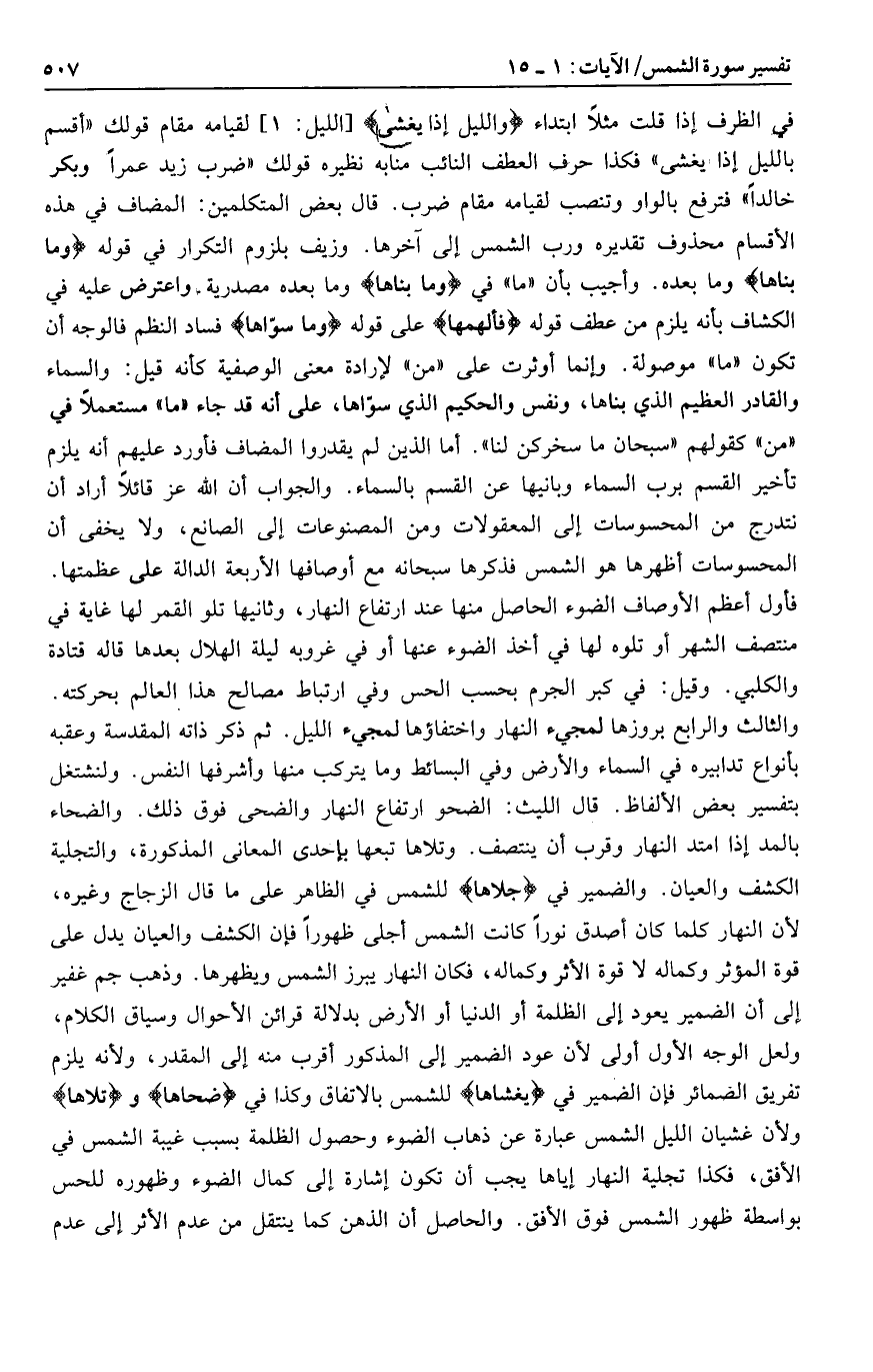 في الظرف إذا قلت مثلا ابتداء وَاللَّيْلِ إِذا يَغْشى [الليل: 1] لقيامه مقام قولك «أقسم بالليل إذا يغشى» فكذا حرف العطف النائب منابه نظيره قولك «ضرب زيد عمرا وبكر خالدا» فترفع بالواو وتنصب لقيامه مقام ضرب. قال بعض المتكلمين: المضاف في هذه الأقسام محذوف تقديره ورب الشمس إلى آخرها. وزيف بلزوم التكرار في قوله وَما بَناها وما بعده. وأجيب بأن «ما» في وَما بَناها وما بعده مصدرية. واعترض عليه في الكشاف بأنه يلزم من عطف قوله فَأَلْهَمَها على قوله وَما سَوَّاها فساد النظم فالوجه أن تكون «ما» موصولة. وإنما أوثرت على «من» لإرادة معنى الوصفية كأنه قيل: والسماء والقادر العظيم الذي بناها، ونفس والحكيم الذي سوّاها، على أنه قد جاء «ما» مستعملا في «من» كقولهم «سبحان ما سخر كن لنا» . أما الذين لم يقدروا المضاف فأورد عليهم أنه يلزم تأخير القسم برب السماء وبانيها عن القسم بالسماء. والجواب أن الله عز قائلا أراد أن نتدرج من المحسوسات إلى المعقولات ومن المصنوعات إلى الصانع، ولا يخفى أن المحسوسات أظهرها هو الشمس فذكرها سبحانه مع أوصافها الأربعة الدالة على عظمتها.
