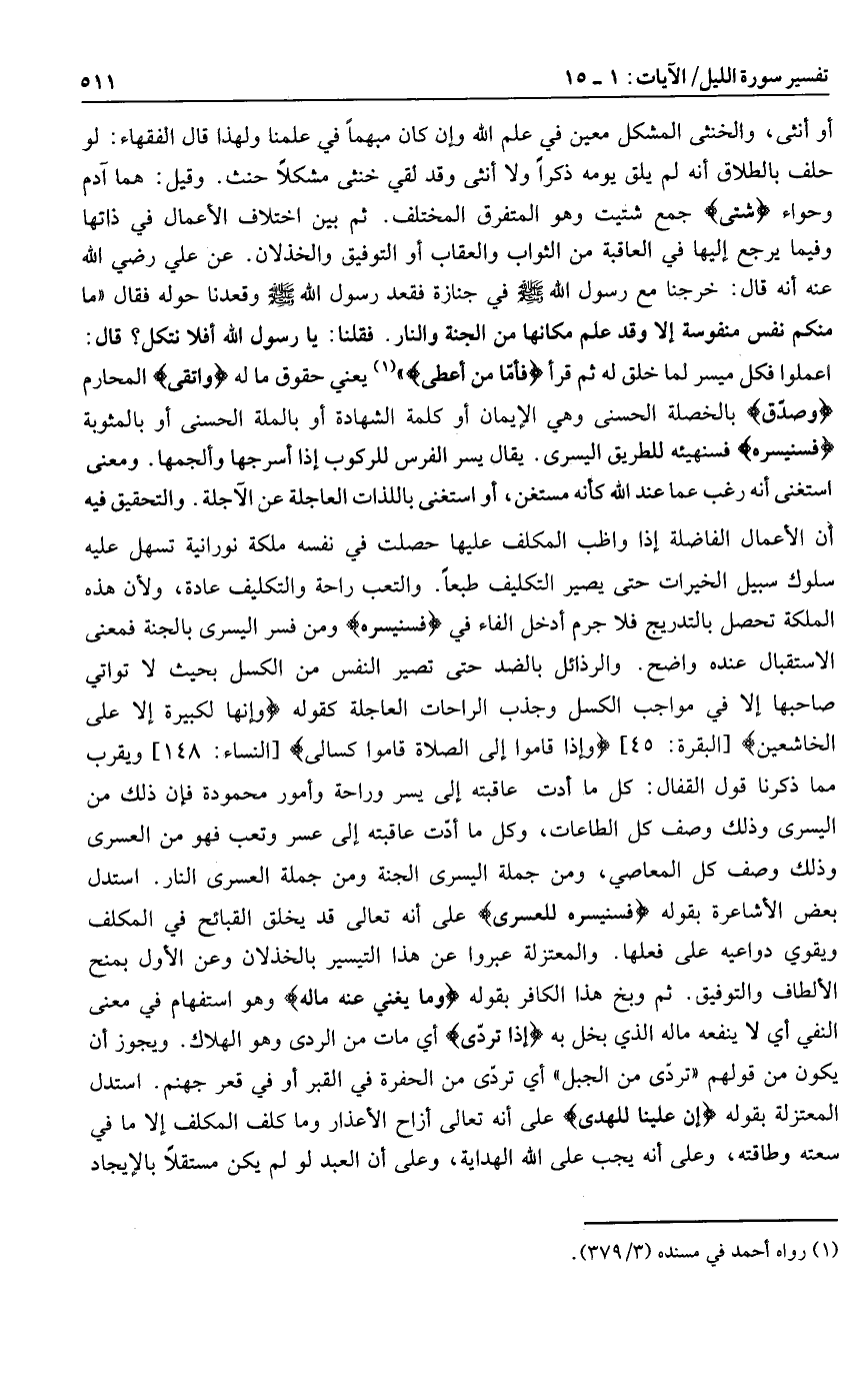 يعني حقوق ما له وَاتَّقى المحارم وَصَدَّقَ بالخصلة الحسنى وهي الإيمان أو كلمة الشهادة أو بالملة الحسنى أو بالمثوبة فَسَنُيَسِّرُهُ فسنهيئه للطريق اليسرى. يقال يسر الفرس للركوب إذا أسرجها وألجمها. ومعنى استغنى أنه رغب عما عند الله كأنه مستغن، أو استغنى باللذات العاجلة عن الآجلة. والتحقيق فيه أن الأعمال الفاضلة إذا واظب المكلف عليها حصلت في نفسه ملكة نورانية تسهل عليه سلوك سبيل الخيرات حتى يصير التكليف طبعا. والتعب راحة والتكليف عادة، ولأن هذه الملكة تحصل بالتدريج فلا جرم أدخل الفاء في فَسَنُيَسِّرُهُ ومن فسر اليسرى بالجنة فمعنى الاستقبال عنده واضح. والرذائل بالضد حتى تصير النفس من الكسل بحيث لا تواتي صاحبها إلا في مواجب الكسل وجذب الراحات العاجلة كقوله وَإِنَّها لَكَبِيرَةٌ إِلَّا عَلَى الْخاشِعِينَ [البقرة: 45] وَإِذا قامُوا إِلَى الصَّلاةِ قامُوا كُسالى