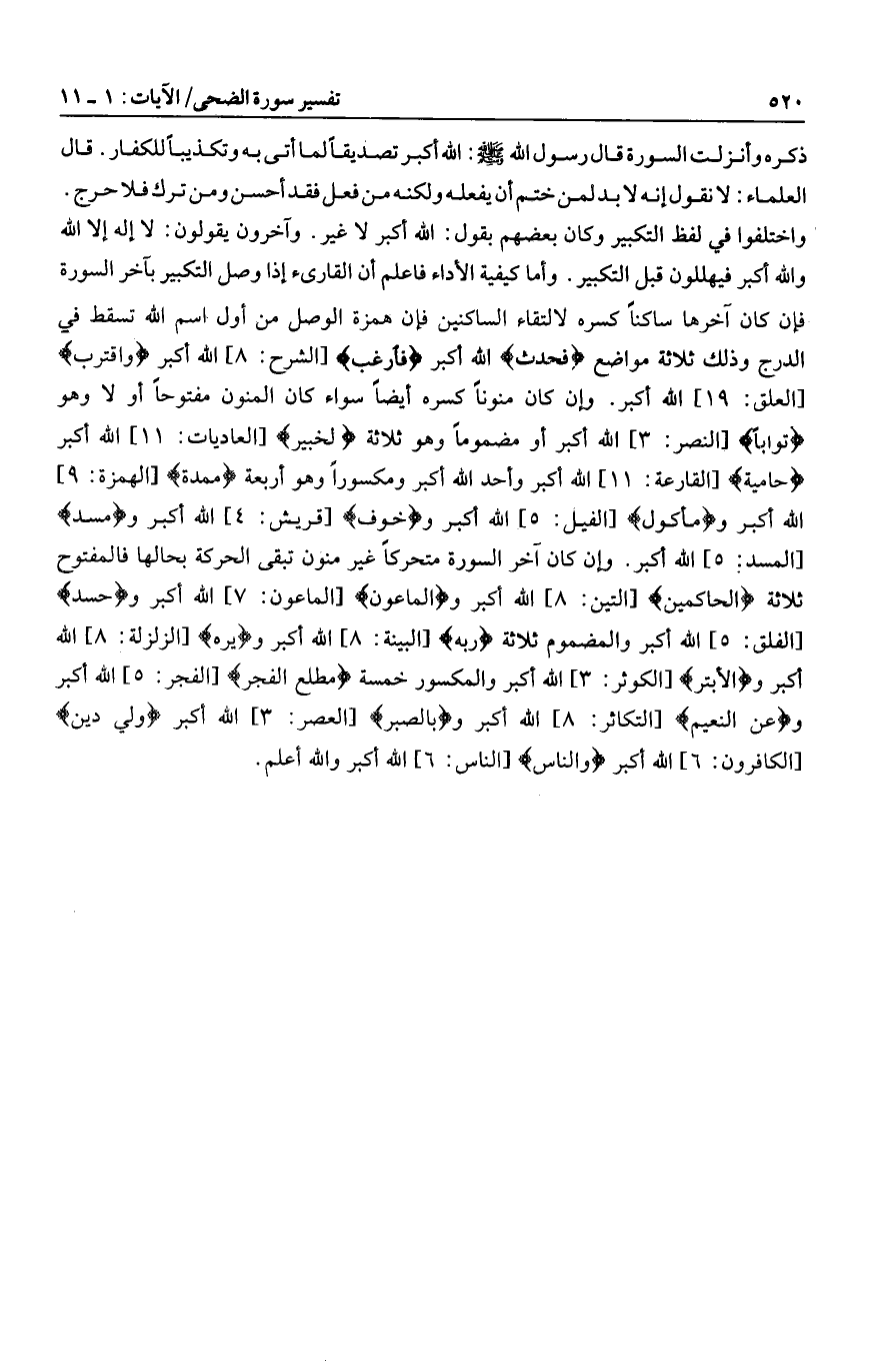 [الشرح: 8] الله أكبر وَاقْتَرِبْ [العلق: 19] الله أكبر. وإن كان منونا كسره أيضا سواء كان المنون مفتوحا أو لا وهو تَوَّاباً [النصر: 3] الله أكبر أو مضموما وهو ثلاثة لَخَبِيرٌ [العاديات: 11] الله أكبر حامِيَةٌ [القارعة: 11] الله أكبر وأحد الله أكبر ومكسورا وهو أربعة مُمَدَّدَةٍ [الهمزة: 9] الله أكبر ومَأْكُولٍ [الفيل: 5] الله أكبر وخَوْفٍ [قريش: 4] الله أكبر ومَسَدٍ [المسد: 5] الله أكبر. وإن كان آخر السورة متحركا غير منون تبقى الحركة بحالها فالمفتوح ثلاثة الْحاكِمِينَ [التين: 8] الله أكبر والْماعُونَ [الماعون: 7] الله أكبر وحَسَدَ [الفلق: 5] الله أكبر والمضموم ثلاثة رَبَّهُ [البينة: 8] الله أكبر ويَرَهُ [الزلزلة: 8] الله أكبر والْأَبْتَرُ [الكوثر: 3] الله أكبر والمكسور خمسة مَطْلَعِ الْفَجْرِ [الفجر: 5] الله أكبر وعَنِ النَّعِيمِ [التكاثر: 8] الله أكبر وبِالصَّبْرِ [العصر: 3] الله أكبر وَلِيَ دِينِ [الكافرون: 6] الله أكبر وَالنَّاسِ [الناس: 6] الله أكبر والله أعلم.