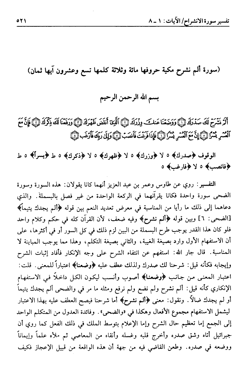 صَدْرَكَ هـ لا وِزْرَكَ هـ لا ظَهْرَكَ هـ لا ذِكْرَكَ هـ ط يُسْراً هـ ط فَانْصَبْ هـ لا فَارْغَبْ هـ