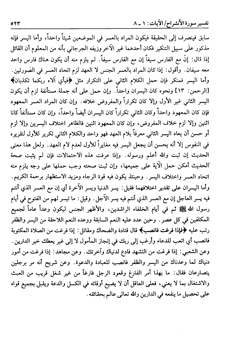 وأما اليسر فمنكر فإن حمل الكلام الثاني على التكرار مثل فَبِأَيِّ آلاءِ رَبِّكُما تُكَذِّبانِ [الرحمن: 13] ونحوه كان اليسران واحدا. وإن حمل على أنه جملة مستأنفة لزم أن يكون اليسر الثاني غير الأول وإلا كان تكرارا والمفروض خلافه. وإن كان المراد العسر المعهود فإن كان المعهود واحدا وكان الثاني تكرارا كان اليسران أيضا واحدا، وإن كان مستأنفا كانا اثنين وإلا لزم خلاف المفروض، وإن كان المعهود اثنين فالظاهر اختلاف اليسرين وإلا لزم أو حسن أن يعاد اليسر الثاني معرفا بلام العهد فهو واحد والكلام الثاني تكرير للأول لتقريره في النفوس إلا أنه يحسن أن يجعل اليسر فيه مغايرا للأول لعدم لام العهد. ولعل هذا معنى الحديث إن ثبت والله أعلم ورسوله. وإذا عرفت هذه الاحتمالات فإن لم يثبت صحة الحديث أمكن حمل الآية على جميعها، وإن ثبت صحته وجب حملها على وجه يلزم منه اتحاد العسر واختلاف اليسر. وحينئذ يكون فيه قوة الرجاء ومزيد الاستظهار برحمة الكريم.