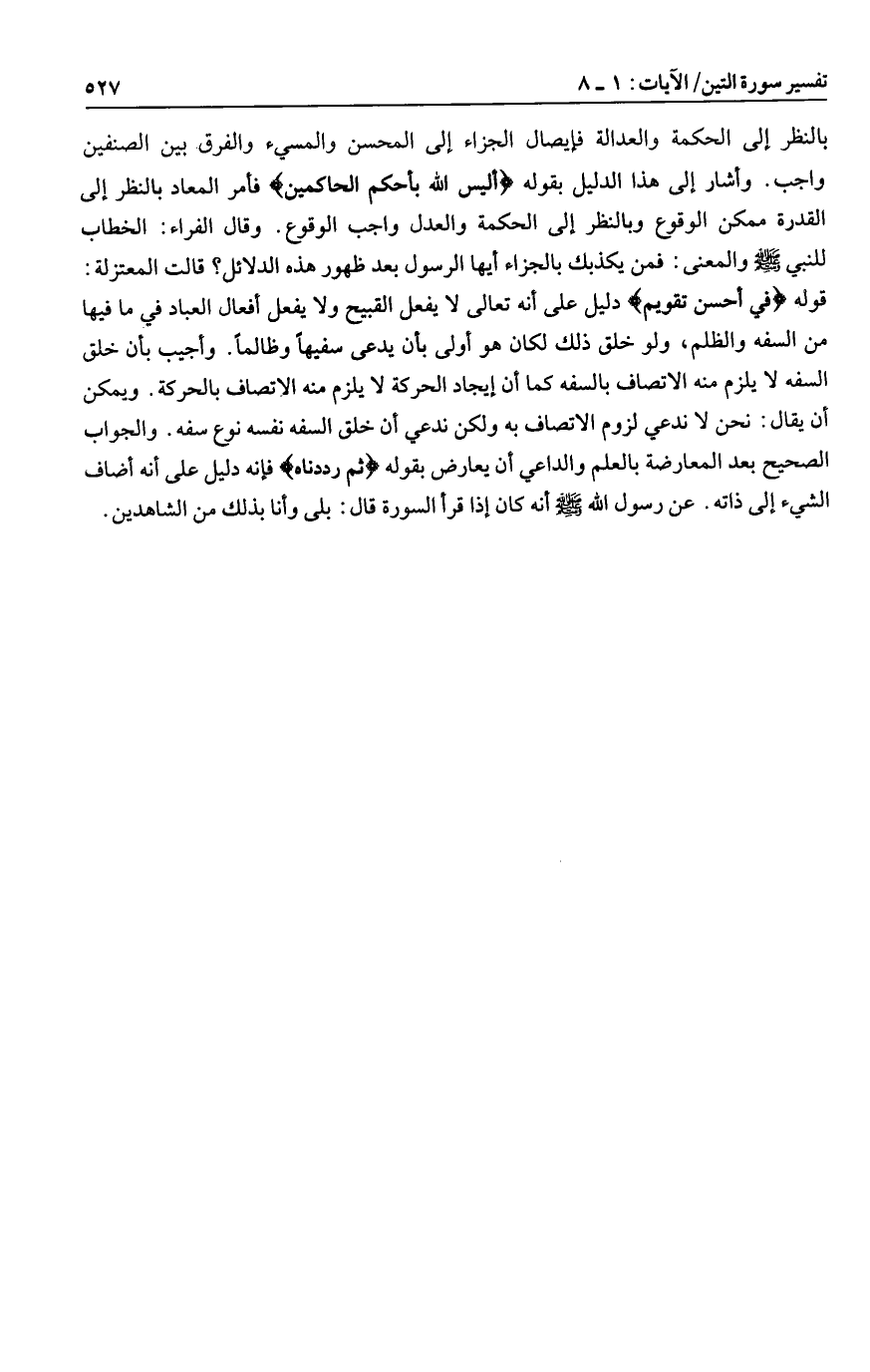 قوله فِي أَحْسَنِ تَقْوِيمٍ دليل على أنه تعالى لا يفعل القبيح ولا يفعل أفعال العباد في ما فيها من السفه والظلم، ولو خلق ذلك لكان هو أولى بأن يدعى سفيها وظالما. وأجيب بأن خلق السفه لا يلزم منه الاتصاف بالسفه كما أن إيجاد الحركة لا يلزم منه الاتصاف بالحركة. ويمكن أن يقال: نحن لا ندعي لزوم الاتصاف به ولكن ندعي أن خلق السفه نفسه نوع سفه. والجواب الصحيح بعد المعارضة بالعلم والداعي أن يعارض بقوله ثُمَّ رَدَدْناهُ فإنه دليل على أنه أضاف الشيء إلى ذاته.