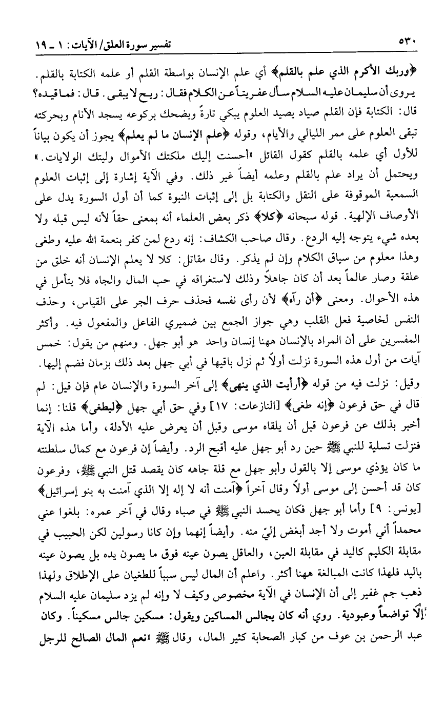 ويحتمل أن يراد علم بالقلم وعلمه أيضا غير ذلك. وفي الآية إشارة إلى إثبات العلوم السمعية الموقوفة على النقل والكتابة بل إلى إثبات النبوة كما أن أول السورة يدل على الأوصاف الإلهية. قوله سبحانه كَلَّا ذكر بعض العلماء أنه بمعنى حقا لأنه ليس قبله ولا بعده شيء يتوجه إليه الردع. وقال صاحب الكشاف: إنه ردع لمن كفر بنعمة الله عليه وطغى وهذا معلوم من سياق الكلام وإن لم يذكر. وقال مقاتل: كلا لا يعلم الإنسان أنه خلق من علقة وصار عالما بعد أن كان جاهلا وذلك لاستغراقه في حب المال والجاه فلا يتأمل في هذه الأحوال. ومعنى أَنْ رَآهُ لأن رأى نفسه فحذف حرف الجر على القياس، وحذف النفس لخاصية فعل القلب وهي جواز الجمع بين ضميري الفاعل والمفعول فيه. وأكثر المفسرين على أن المراد بالإنسان هاهنا إنسان واحد هو أبو جهل. ومنهم من يقول: خمس آيات من أول هذه السورة نزلت أولا ثم نزل باقيها في أبي جهل بعد ذلك بزمان فضم إليها.