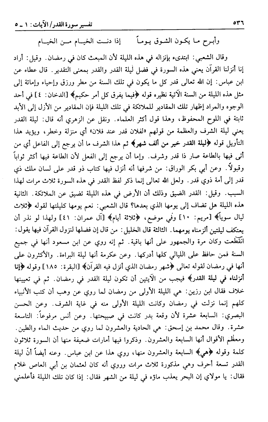 وقال الشعبي: ابتدئ بإنزاله في هذه الليلة لأن المبعث كان في رمضان. وقيل: أراد إنا أنزلنا القرآن يعني هذه السورة في فضل ليلة القدر والقدر بمعنى التقدير. قال عطاء عن ابن عباس: إن الله تعالى قدر كل ما يكون في تلك السنة من مطر ورزق وإحياء وإماتة إلى مثل هذه الليلة من السنة الآتية نظيره قوله فِيها يُفْرَقُ كُلُّ أَمْرٍ حَكِيمٍ [الدخان: 4] في أحد الوجوه والمراد إظهار تلك المقادير للملائكة في تلك الليلة فإن المقادير من الأزل إلى الأبد ثابتة في اللوح المحفوظ، وهذا قول أكثر العلماء. ونقل عن الزهري أنه قال: ليلة القدر يعني ليلة الشرف والعظمة من قولهم «لفلان قدر عند فلان» أي منزلة وخطر، ويؤيد هذا التأويل قوله لَيْلَةُ الْقَدْرِ خَيْرٌ مِنْ أَلْفِ شَهْرٍ ثم هذا الشرف ما أن يرجع إلى الفاعل أي من أتى فيها بالطاعة صار ذا قدر وشرف. وإما أن يرجع إلى الفعل لأن الطاعة فيها أكثر ثوابا وقبولا. وعن أبي بكر الوراق: من شرفها أنه أنزل فيها كتاب ذو قدر على لسان ملك ذي قدر إلى أمة ذوي قدر. ولعل الله تعالى إنما ذكر لفظ القدر في هذه السورة ثلاث مرات لهذا السبب. وقيل: القدر الضيق وذلك أن الأرض في هذه الليلة تضيق عن الملائكة. الثانية هذه الليلة هل تضاف إلى يومها الذي بعدها؟ قال الشعبي: نعم يومها كليلتها لقوله ثَلاثَ لَيالٍ سَوِيًّا [مريم: 10] وفي موضع، ثَلاثَةَ أَيَّامٍ [آل عمران: 41] ولهذا لو نذر أن يعتكف ليلتين ألزمناه يومهما. الثالثة قال الخليل: من قال إن فضلها لنزول القرآن فيها يقول: