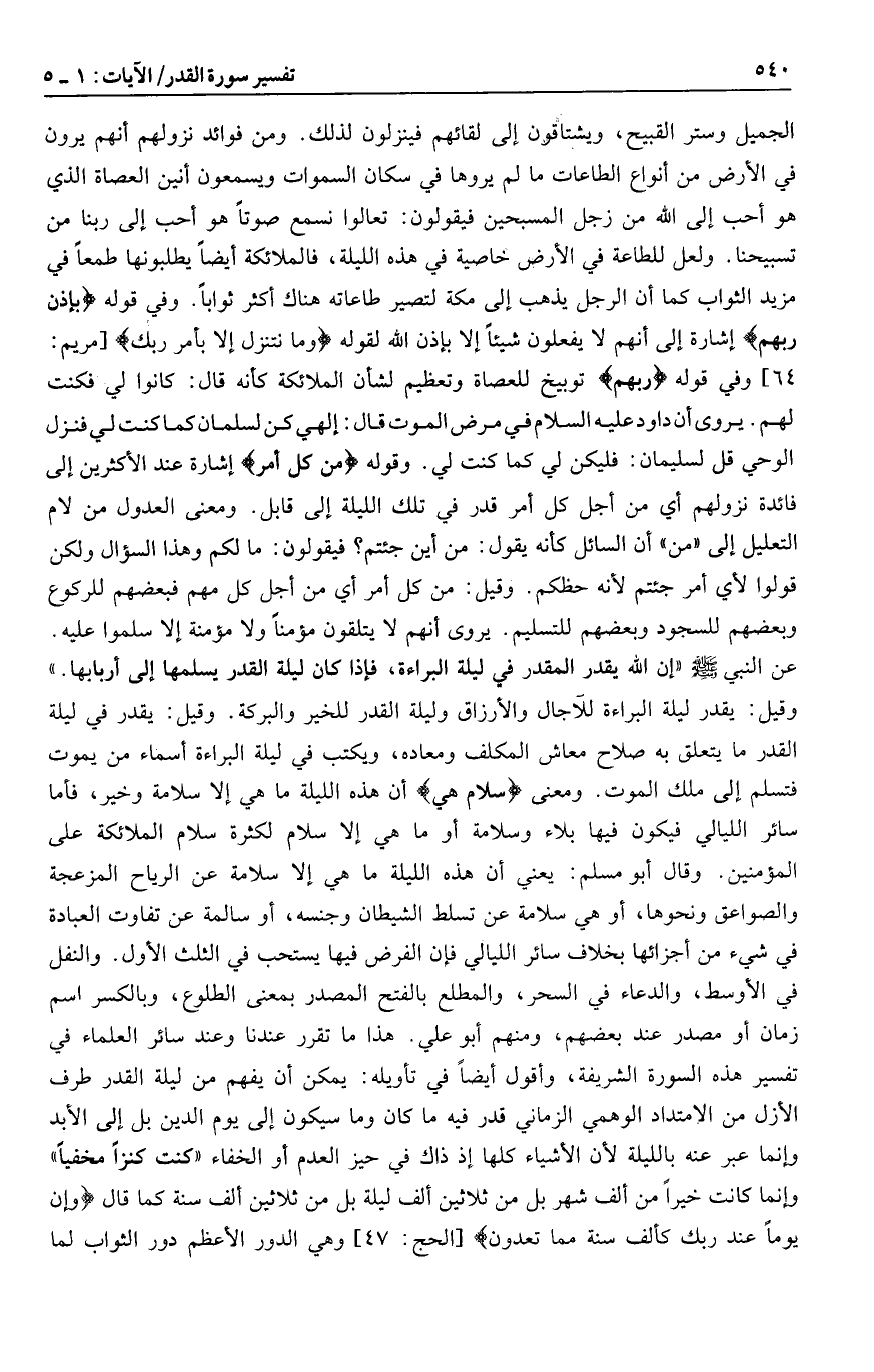 ومن فوائد نزولهم أنهم يرون في الأرض من أنواع الطاعات ما لم يروها في سكان السموات ويسمعون أنين العصاة الذي هو أحب إلى الله من زجل المسبحين فيقولون: تعالوا نسمع صوتا هو أحب إلى ربنا من تسبيحنا. ولعل للطاعة في الأرض خاصية في هذه الليلة، فالملائكة أيضا يطلبونها طمعا في مزيد الثواب كما أن الرجل يذهب إلى مكة لتصير طاعاته هناك أكثر ثوابا. وفي قوله بِإِذْنِ رَبِّهِمْ إشارة إلى أنهم لا يفعلون شيئا إلا بإذن الله لقوله وَما نَتَنَزَّلُ إِلَّا بِأَمْرِ رَبِّكَ [مريم: