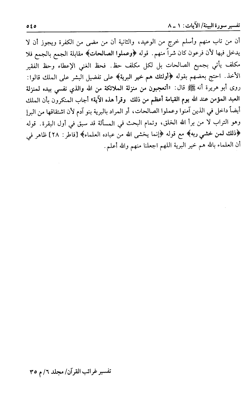 أن من تاب منهم وأسلم خرج من الوعيد، والثانية أن من مضى من الكفرة ويجوز أن لا يدخل فيها لأن فرعون كان شرا منهم. قوله وَعَمِلُوا الصَّالِحاتِ مقابلة الجمع بالجمع فلا مكلف يأتي بجميع الصالحات بل لكل مكلف حظ. فحظ الغني الإعطاء وحظ الفقير الأخذ. احتج بعضهم بقوله أُولئِكَ هُمْ خَيْرُ الْبَرِيَّةِ على تفضيل البشر على الملك قالوا: