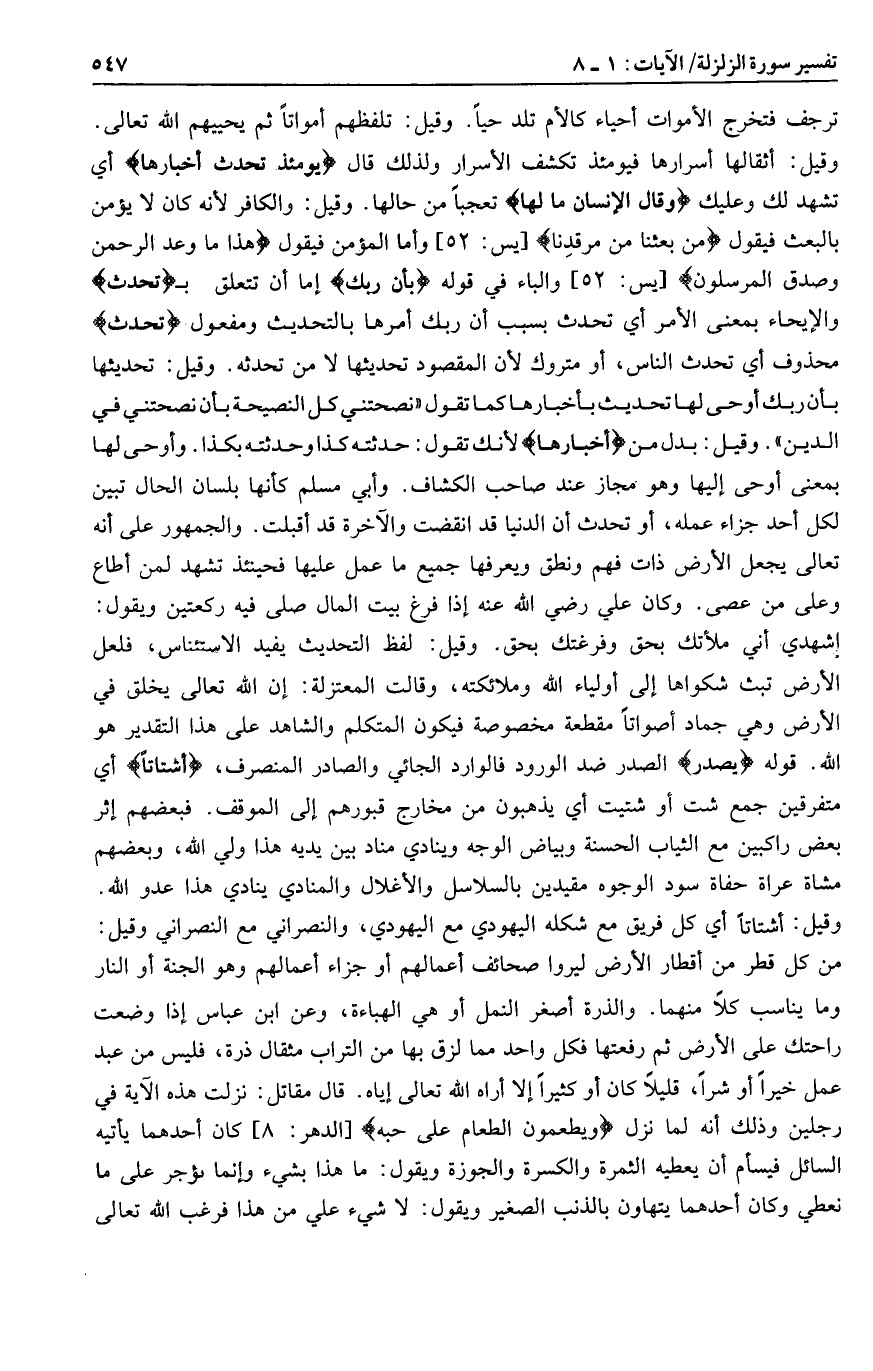 وقيل: لفظ التحديث يفيد الاستئناس، فلعل الأرض تبث شكواها إلى أولياء الله وملائكته، وقالت المعتزلة: إن الله تعالى يخلق في الأرض وهي جماد أصواتا مقطعة مخصوصة فيكون المتكلم والشاهد على هذا التقدير هو الله. قوله يَصْدُرُ الصدر ضد الورود فالوارد الجائي والصادر المنصرف، أَشْتاتاً أي متفرقين جمع شت أو شتيت أي يذهبون من مخارج قبورهم إلى الموقف. فبعضهم إثر بعض راكبين مع الثياب الحسنة وبياض الوجه وينادي مناد بين يديه هذا ولي الله، وبعضهم مشاة عراة حفاة سود الوجوه مقيدين بالسلاسل والأغلال والمنادي ينادي هذا عدو الله.