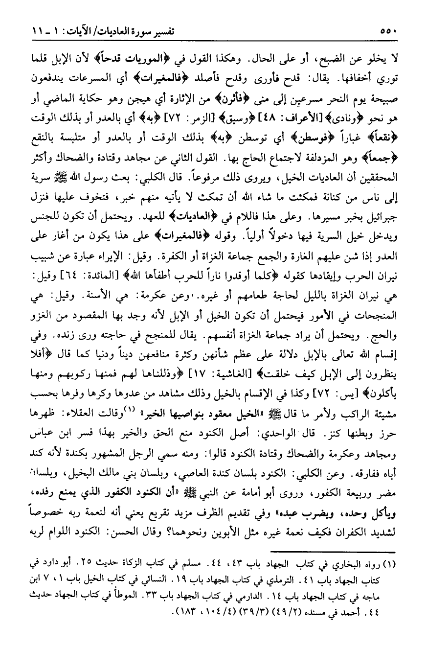 لا يخلو عن الضبح، أو على الحال. وهكذا القول في فَالْمُورِياتِ قَدْحاً لأن الإبل قلما توري أخفافها. يقال: قدح فأورى وقدح فأصلد فَالْمُغِيراتِ أي المسرعات يندفعون صبيحة يوم النحر مسرعين إلى منى فَأَثَرْنَ من الإثارة أي هيجن وهو حكاية الماضي أو هو نحو وَنادى [الأعراف: 48] وَسِيقَ [الزمر: 72] بِهِ أي بالعدو أو بذلك الوقت نَقْعاً غبارا فَوَسَطْنَ أي توسطن بِهِ بذلك الوقت أو بالعدو أو متلبسة بالنقع جَمْعاً وهو المزدلفة لاجتماع الحاج بها. القول الثاني عن مجاهد وقتادة والضحاك وأكثر المحققين أن العاديات الخيل، ويروى ذلك مرفوعا.