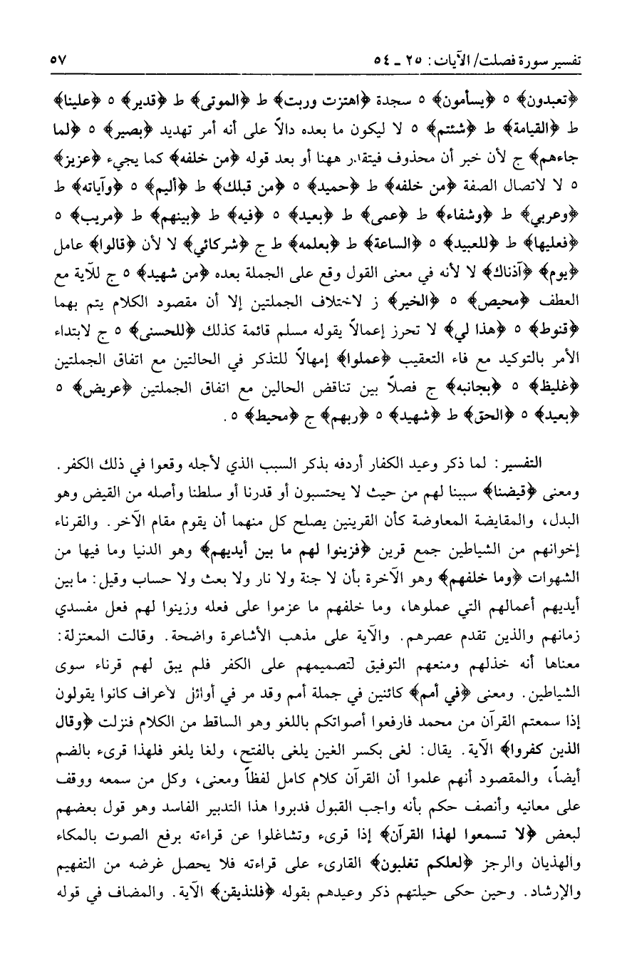 تَعْبُدُونَ هـ يَسْأَمُونَ هـ سجدة اهْتَزَّتْ وَرَبَتْ ط الْمَوْتى ط قَدِيرٌ هـ عَلَيْنا ط الْقِيامَةِ ط شِئْتُمْ هـ لا ليكون ما بعده دالا على أنه أمر تهديد بَصِيرٌ هـ لَمَّا جاءَهُمْ ج لأن خبر أن محذوف فيتقدر هاهنا أو بعد قوله مِنْ خَلْفِهِ كما يجيء عَزِيزٌ هـ لا لاتصال الصفة مِنْ خَلْفِهِ ط حَمِيدٍ هـ مِنْ قَبْلِكَ ط أَلِيمٍ هـ آياتُهُ ط وَعَرَبِيٌّ ط وَشِفاءٌ ط عَمًى ط بَعِيدٍ هـ فِيهِ ط بَيْنَهُمْ ط مُرِيبٍ هـ فَعَلَيْها ط لِلْعَبِيدِ هـ السَّاعَةِ ط بِعِلْمِهِ ط ج شُرَكائِي لا لأن قالُوا عامل يَوْمَ آذَنَّاكَ لا لأنه في معنى القول وقع على الجملة بعده مِنْ شَهِيدٍ هـ ج للآية مع العطف مَحِيصٍ هـ الْخَيْرِ ز لاختلاف الجملتين إلا أن مقصود الكلام يتم بهما قَنُوطٌ هـ هذا لِي لا تحرز إعمالا يقوله مسلم قائمة كذلك لَلْحُسْنى هـ ج لابتداء الأمر بالتوكيد مع فاء التعقيب عَمِلُوا إمهالا للتذكر في الحالتين مع اتفاق الجملتين غَلِيظٍ هـ بِجانِبِهِ ج فصلا بين تناقض الحالين مع اتفاق الجملتين عَرِيضٍ هـ بَعِيدٍ هـ الْحَقُّ ط شَهِيدٌ هـ رَبِّهِمْ ج مُحِيطٌ هـ.