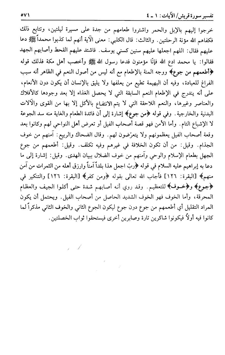 ووجه المنة بالإطعام مع أنه ليس من أصول النعم في الظاهر أنه سبب الفراغ للعبادة، وفيه أن البهيمة تطيع من يعلفها ولا يليق بالإنسان أن يكون دون الأنعام، على أنه يندرج في الإطعام النعم السابقة التي لا يحصل الغذاء إلا بعد وجودها كالأفلاك والعناصر وغيرها، والنعم اللاحقة التي لا يتم الانتفاع بالأكل إلا بها من القوى والآلات البدنية والخارجية. وفي قوله مِنْ جُوعٍ إشارة إلى أن فائدة الطعام والغاية منه سد الجوعة لا الإشباع التام. وأما الأمن فهو قصة أصحاب الفيل أو تعرض أهل النواحي لهم وكانوا بعد وقعة أصحاب الفيل يعظمونهم ولا يتعرّضون لهم. وقال الضحاك والربيع: آمنهم من خوف الجذام. وقيل: من أن تكون الخلافة في غيرهم وفيه تكلف. وقيل: أطعمهم من جوع الجهل بطعام الإسلام والوحي وآمنهم من خوف الضلال ببيان الهدى. وقيل: إشارة إلى ما دعا به إبراهيم عليه السلام في قوله رَبِّ اجْعَلْ هذا بَلَداً آمِناً وَارْزُقْ أَهْلَهُ مِنَ الثَّمَراتِ مَنْ آمَنَ مِنْهُمْ [البقرة: 126] فأجاب الله تعالى بقوله وَمَنْ كَفَرَ [البقرة: 126] والتنكير في جُوعٍ وخَوْفٍ للتعظيم. وقد روي أنه أصابهم شدة حتى أكلوا الجيف والعظام المحرقة، وأما الخوف فهو الخوف الشديد الحاصل من أصحاب الفيل. ويحتمل أن يكون المراد التقليل أي أطعمهم من جوع دون جوع ليكون الجوع الثاني والخوف الثاني مذكرا لما كانوا فيه أولا فيكونوا شاكرين تارة وصابرين أخرى فيستحقوا ثواب الخصلتين.