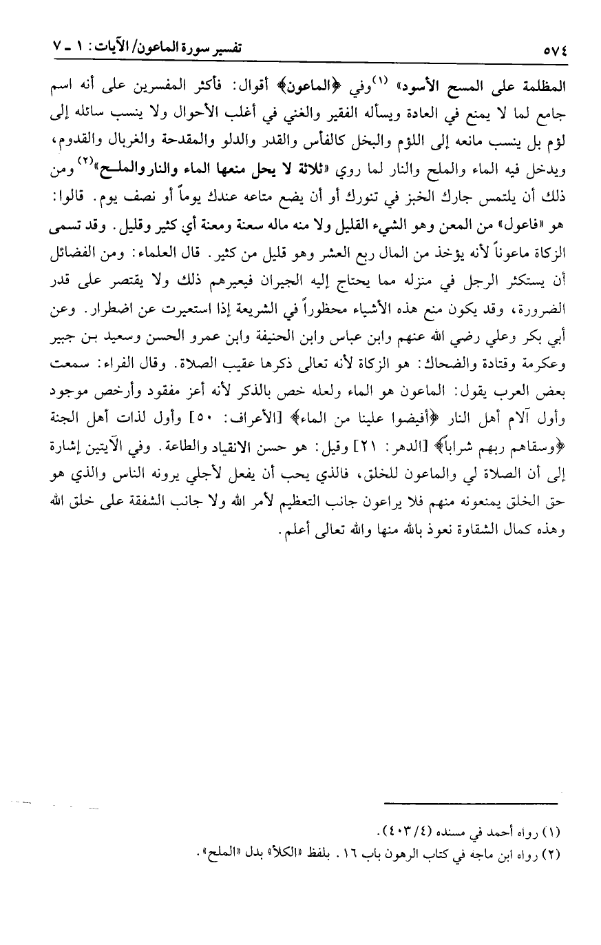 وفي الْماعُونَ أقوال: فأكثر المفسرين على أنه اسم جامع لما لا يمنع في العادة ويسأله الفقير والغني في أغلب الأحوال ولا ينسب سائله إلى لؤم بل ينسب مانعه إلى اللؤم والبخل كالفأس والقدر والدلو والمقدحة والغربال والقدوم، ويدخل فيه الماء والملح والنار لما