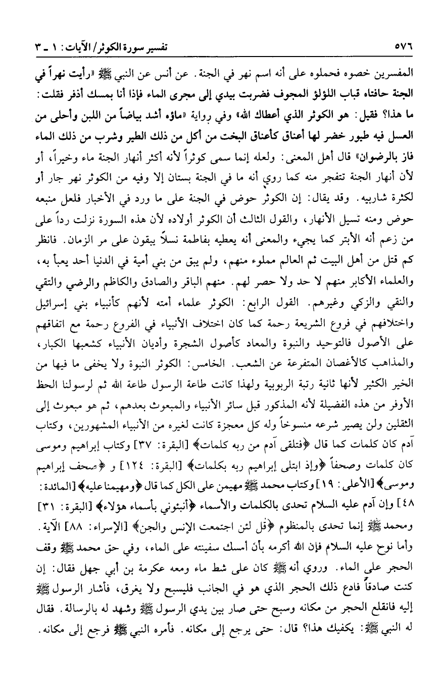 وقد يقال: إن الكوثر حوض في الجنة على ما ورد في الأخبار فلعل منبعه حوض ومنه تسيل الأنهار، والقول الثالث أن الكوثر أولاده لأن هذه السورة نزلت ردا على من زعم أنه الأبتر كما يجيء والمعنى أنه يعطيه بفاطمة نسلا يبقون على مر الزمان. فانظر كم قتل من أهل البيت ثم العالم مملوء منهم، ولم يبق من بني أمية في الدنيا أحد يعبأ به، والعلماء الأكابر منهم لا حد ولا حصر لهم. منهم الباقر والصادق والكاظم والرضي والتقي والنقي والزكي وغيرهم. القول الرابع: الكوثر علماء أمته لأنهم كأنبياء بني إسرائيل واختلافهم في فروع الشريعة رحمة كما كان اختلاف الأنبياء في الفروع رحمة مع اتفاقهم على الأصول فالتوحيد والنبوة والمعاد كأصول الشجرة وأديان الأنبياء كشعبها الكبار، والمذاهب كالأغصان المتفرعة عن الشعب. الخامس: الكوثر النبوة ولا يخفى ما فيها من الخير الكثير لأنها ثانية رتبة الربوبية ولهذا كانت طاعة الرسول طاعة الله ثم لرسولنا الحظ الأوفر من هذه الفضيلة لأنه المذكور قبل سائر الأنبياء والمبعوث بعدهم، ثم هو مبعوث إلى الثقلين ولن يصير شرعه منسوخا وله كل معجزة كانت لغيره من الأنبياء المشهورين، وكتاب آدم كان كلمات كما قال فَتَلَقَّى آدَمُ مِنْ رَبِّهِ كَلِماتٍ [البقرة: 37] وكتاب ابراهيم وموسى كان كلمات وصحفا وَإِذِ ابْتَلى إِبْراهِيمَ رَبُّهُ بِكَلِماتٍ [البقرة: 124] وصُحُفِ إِبْراهِيمَ وَمُوسى [الأعلى: 19] وكتاب محمد صلى الله عليه وسلم مهيمن على الكل كما قال وَمُهَيْمِناً عَلَيْهِ [المائدة:
