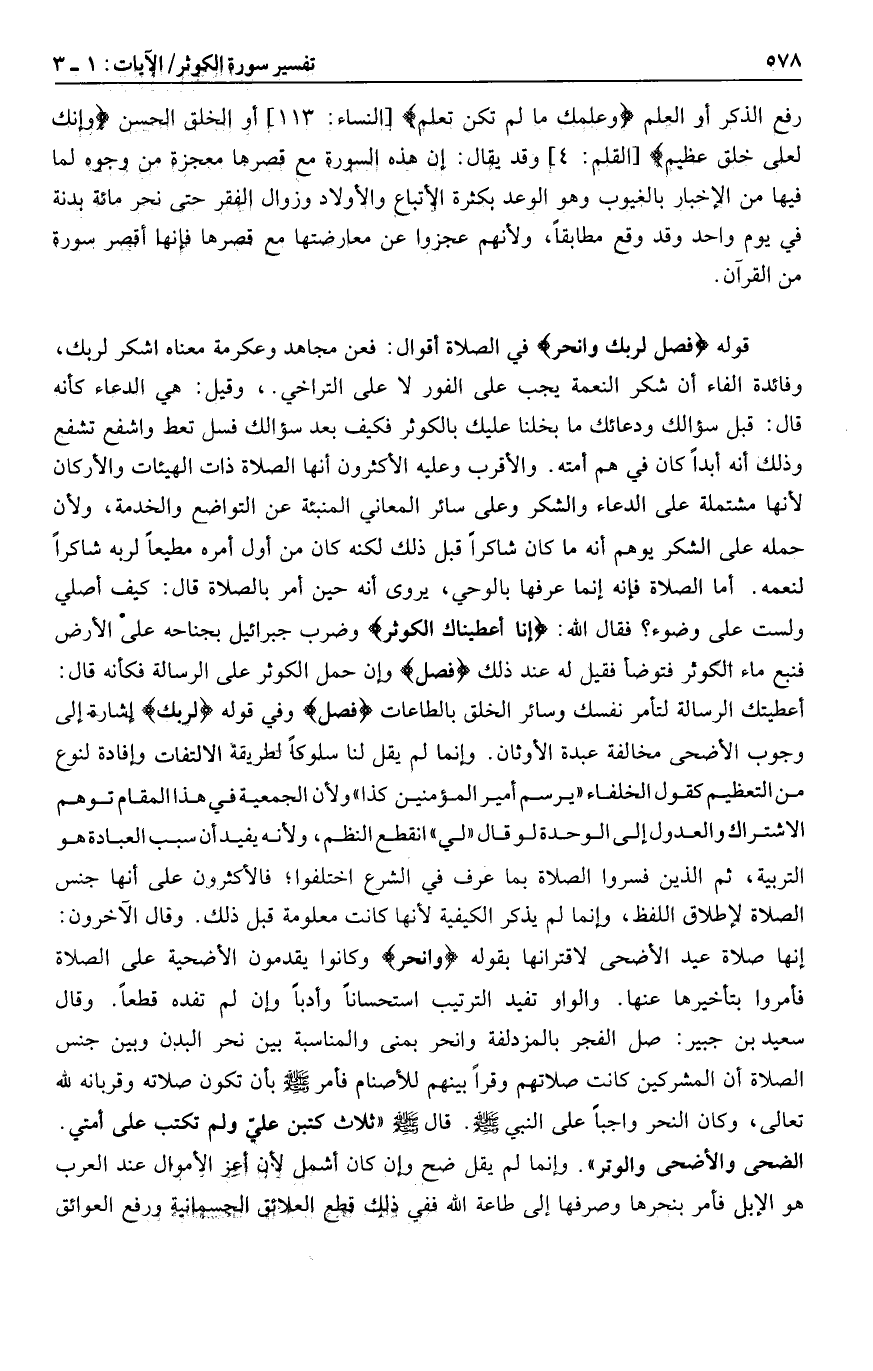 قوله فَصَلِّ لِرَبِّكَ وَانْحَرْ في الصلاة أقوال: فعن مجاهد وعكرمة معناه اشكر لربك، وفائدة الفاء أن شكر النعمة يجب على الفور لا على التراخي، وقيل: هي الدعاء كأنه قال: قبل سؤالك ودعائك ما بخلنا عليك بالكوثر فكيف بعد سؤالك فسل تعط واشفع تشفع وذلك أنه أبدا كان في هم أمته. والأقرب وعليه الأكثرون أنها الصلاة ذات الهيئات والأركان لأنها مشتملة على الدعاء والشكر وعلى سائر المعاني المنبئة عن التواضع والخدمة، ولأن حمله على الشكر يوهم أنه ما كان شاكرا قبل ذلك لكنه كان من أول أمره مطيعا لربه شاكرا لنعمه. أما الصلاة فإنه إنما عرفها بالوحي،