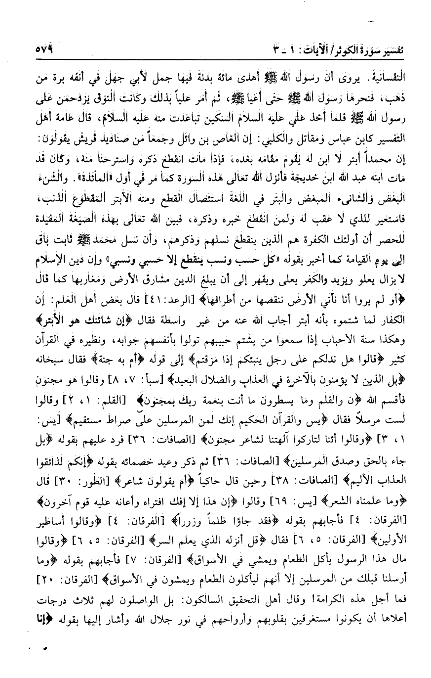1، 3] وَيَقُولُونَ أَإِنَّا لَتارِكُوا آلِهَتِنا لِشاعِرٍ مَجْنُونٍ [الصافات: 36] فرد عليهم بقوله بَلْ جاءَ بِالْحَقِّ وَصَدَّقَ الْمُرْسَلِينَ [الصافات: 36] ثم ذكر وعيد خصمائه بقوله إِنَّكُمْ لَذائِقُوا الْعَذابِ الْأَلِيمِ [الصافات: 38] وحين قال حاكيا أَمْ يَقُولُونَ شاعِرٌ [الطور: 30] قال وَما عَلَّمْناهُ الشِّعْرَ [يس: 69] وقالوا إِنْ هَذا إِلَّا إِفْكٌ افْتَراهُ وَأَعانَهُ عَلَيْهِ قَوْمٌ آخَرُونَ [الفرقان: 4] فأجابهم بقوله فَقَدْ جاؤُ ظُلْماً وَزُوراً [الفرقان: 4] وَقالُوا أَساطِيرُ الْأَوَّلِينَ [الفرقان: 5، 6] فقال قُلْ أَنْزَلَهُ الَّذِي يَعْلَمُ السِّرَّ [الفرقان: 5، 6] وَقالُوا مالِ هذَا الرَّسُولِ يَأْكُلُ الطَّعامَ وَيَمْشِي فِي الْأَسْواقِ [الفرقان: 7] فأجابهم بقوله وَما أَرْسَلْنا قَبْلَكَ مِنَ الْمُرْسَلِينَ إِلَّا إِنَّهُمْ لَيَأْكُلُونَ الطَّعامَ وَيَمْشُونَ فِي الْأَسْواقِ [الفرقان: 20] فما أجل هذه الكرامة! وقال أهل التحقيق السالكون: بل الواصلون لهم ثلاث درجات أعلاها أن يكونوا مستغرقين بقلوبهم وأرواحهم في نور جلال الله وأشار إليها بقوله