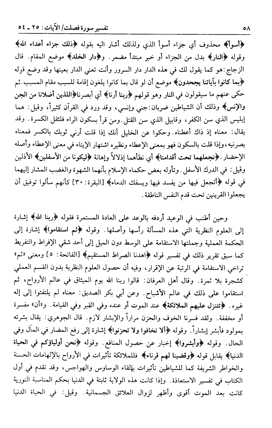 أَسْوَأَ محذوف أي جزاء أسوأ الذي ولذلك أشار اليه بقوله ذلِكَ جَزاءُ أَعْداءِ اللَّهِ وقوله النَّارُ بدل من الجزاء أو خبر مبتدأ مضمر. ودارُ الْخُلْدِ موضع المقام. قال الزجاج: هو كما يقول لك في هذه الدار دار السرور وأنت تعني الدار بعينها وقد وضع قوله بِما كانُوا بِآياتِنا يَجْحَدُونَ موضع أن لو قال بما كانوا يلغون إقامة للسبب مقام المسبب ثم حكى عنهم ما سيقولون في النار وهو قولهم رَبَّنا أَرِنَا أي أبصرنا الَّذَيْنِ أَضَلَّانا مِنَ الْجِنِّ وَالْإِنْسِ وذلك أن الشياطين ضربان: جني وإنسي، وقد ورد في القرآن كثيرا، وقيل: هما إبليس الذي سن الكفر، وقابيل الذي سن القتل. ومن قرأ بسكون الراء فلثقل الكسرة. وقد يقال: معناه إذ ذاك أعطناه. وحكوا عن الخليل أنك إذا قلت أرني ثوبك بالكسر فمعناه بصرنيه، وإذا قلت بالسكون فهو بمعنى الإعطاء ونظيره اشتهار الإيتاء في معنى الإعطاء وأصله الإحضار. نَجْعَلْهُما تَحْتَ أَقْدامِنا أي نطأهما إذلالا وإهانة لِيَكُونا مِنَ الْأَسْفَلِينَ الأذلين وقيل: في الدرك الأسفل. وتأوله بعض حكماء الإسلام بأنهما الشهوة والغضب المشار إليهما في قوله أَتَجْعَلُ فِيها مَنْ يُفْسِدُ فِيها وَيَسْفِكُ الدِّماءَ [البقرة: 30] كأنهم سألوا توفيق أن يجعلوا القرينين تحت قدم النفس الناطقة.