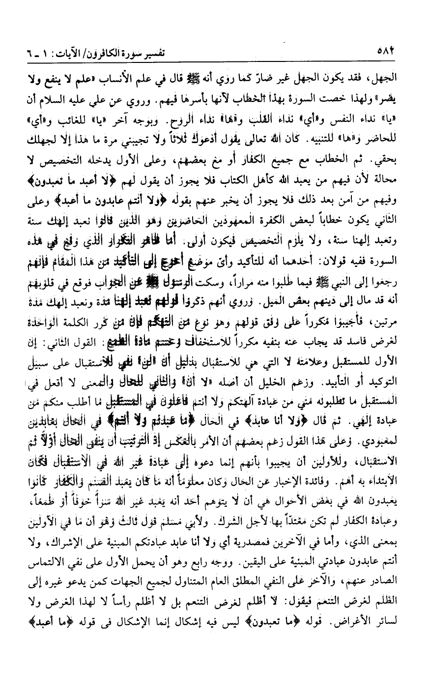 فأجيبوا مكررا على وفق قولهم وهو نوع من التهكم فإن من كرر الكلمة الواحدة لغرض فاسد قد يجاب عنه بنفيه مكررا للاستخفاف وحسم مادة الطمع. القول الثاني: إن الأول للمستقبل وعلامته لا التي هي للاستقبال بدليل أن «لن» نفي للاستقبال على سبيل التوكيد أو التأبيد. وزعم الخليل أن أصله «لا أن» والثاني للحال والمعنى لا أفعل في المستقبل ما تطلبونه مني من عبادة آلهتكم ولا أنتم فاعلون في المستقبل ما أطلب منكم من عبادة إلهي. ثم قال وَلا أَنا عابِدٌ في الحال ما عَبَدْتُّمْ وَلا أَنْتُمْ في الحال بعابدين لمعبودي. وعلى هذا القول زعم بعضهم أن الأمر بالعكس إذ الترتيب أن ينفى الحال أوّلا ثم الاستقبال، وللأولين أن يجيبوا بأنهم إنما دعوه إلى عبادة غير الله في الاستقبال فكان الابتداء به أهم. وفائدة الإخبار عن الحال وكان معلوما أنه ما كان يعبد الصنم والكفار كانوا يعبدون الله في بعض الأحوال هي أن لا يتوهم أحد أنه يعبد غير الله سرا خوفا أو طمعا، وعبادة الكفار لم تكن معتدّا بها لأجل الشرك. ولأبي مسلم قول ثالث وهو أن ما في الأولين بمعنى الذي، وأما في الآخرين فمصدرية أي ولا أنا عابد عبادتكم المبنية على الإشراك، ولا أنتم عابدون عبادتي المبنية على اليقين. ووجه رابع وهو أن يحمل الأول على نفي الالتماس الصادر عنهم، والآخر على النفي المطلق العام المتناول لجميع الجهات كمن يدعو غيره إلى الظلم لغرض التنعم فيقول: لا أظلم لغرض التنعم بل لا أظلم رأسا لا لهذا الغرض ولا لسائر الأغراض. قوله ما تَعْبُدُونَ ليس فيه إشكال إنما الإشكال فى قوله ما أَعْبُدُ