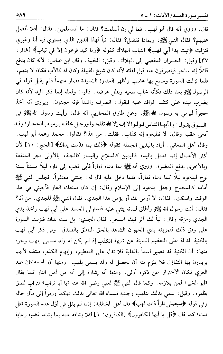 قال. وروي أنه قال أبو لهب: فما لي إن أسلمت؟ فقال: ما للمسلمين. فقال: أفلا أفضل عليهم؟ فقال النبي صلى الله عليه وسلم: وبماذا تفضل؟ فقال: تبا لهذا الدين الذي يستوي فيه أنا وغيري فنزلت تَبَّتْ يَدا أَبِي لَهَبٍ