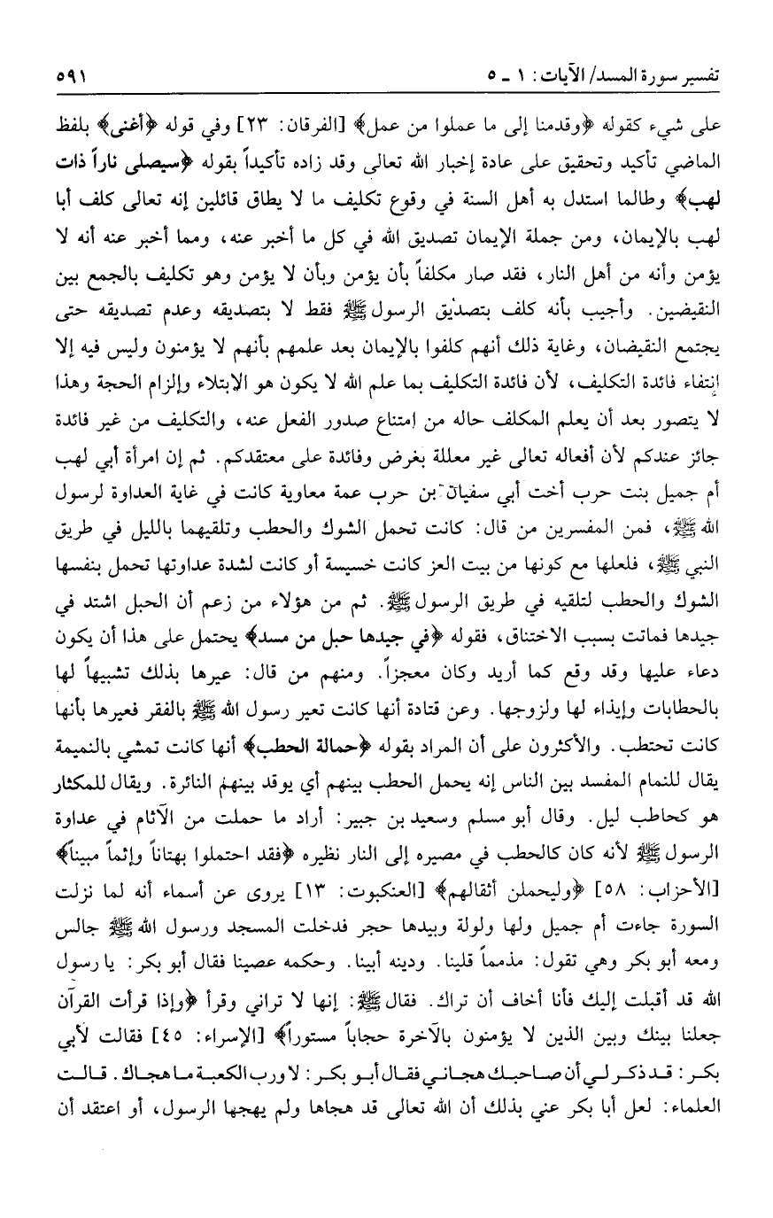 على شيء كقوله وَقَدِمْنا إِلى ما عَمِلُوا مِنْ عَمَلٍ [الفرقان: 23] وفي قوله أَغْنى بلفظ الماضي تأكيد وتحقيق على عادة إخبار الله تعالى وقد زاده تأكيدا بقوله سَيَصْلى ناراً ذاتَ لَهَبٍ وطالما استدل به أهل السنة في وقوع تكليف ما لا يطاق قائلين إنه تعالى كلف أبا لهب بالإيمان، ومن جملة الإيمان تصديق الله في كل ما أخبر عنه، ومما أخبر عنه أنه لا يؤمن وأنه من أهل النار، فقد صار مكلفا بأن يؤمن وبأن لا يؤمن وهو تكليف بالجمع بين النقيضين. وأجيب بأنه كلف بتصديق الرسول صلى الله عليه وسلم فقط لا بتصديقه وعدم تصديقه حتى يجتمع النقيضان، وغاية ذلك أنهم كلفوا بالإيمان بعد علمهم بأنهم لا يؤمنون وليس فيه إلا انتفاء فائدة التكليف، لأن فائدة التكليف بما علم الله لا يكون هو الابتلاء وإلزام الحجة وهذا لا يتصور بعد أن يعلم المكلف حاله من امتناع صدور الفعل عنه، والتكليف من غير فائدة جائز عندكم لأن أفعاله تعالى غير معللة بغرض وفائدة على معتقدكم. ثم إن امرأة أبي لهب أم جميل بنت حرب أخت أبي سفيان بن حرب عمة معاوية كانت في غاية العداوة لرسول الله صلى الله عليه وسلم، فمن المفسرين من قال: كانت تحمل الشوك والحطب وتلقيهما بالليل في طريق النبي صلى الله عليه وسلم، فلعلها مع كونها من بيت العز كانت خسيسة أو كانت لشدة عداوتها تحمل بنفسها الشوك والحطب لتلقيه في طريق الرسول صلى الله عليه وسلم. ثم من هؤلاء من زعم أن الحبل اشتد في جيدها فماتت بسبب الاختناق، فقوله فِي جِيدِها حَبْلٌ مِنْ مَسَدٍ يحتمل على هذا أن يكون دعاء عليها وقد وقع كما أريد وكان معجزا. ومنهم من قال: عيرها بذلك تشبيها لها بالحطابات وإيذاء لها ولزوجها. وعن قتادة أنها كانت تعير رسول الله صلى الله عليه وسلم بالفقر فعيرها بأنها كانت تحتطب. والأكثرون على أن المراد بقوله حَمَّالَةَ الْحَطَبِ أنها كانت تمشي بالنميمة يقال للنمام المفسد بين الناس إنه يحمل الحطب بينهم أي يوقد بينهم النائرة. ويقال للمكثار هو كحاطب ليل. وقال أبو مسلم وسعيد بن جبير: أراد ما حملت من الآثام في عداوة الرسول صلى الله عليه وسلم لأنه كان كالحطب في مصيره إلى النار نظيره فَقَدِ احْتَمَلُوا بُهْتاناً وَإِثْماً مُبِيناً [الأحزاب: 58] وَلَيَحْمِلُنَّ أَثْقالَهُمْ [العنكبوت: 13]