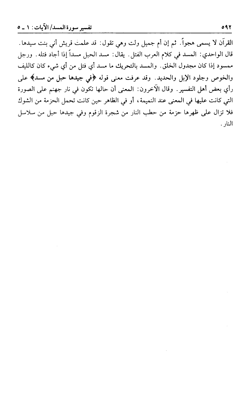 قال الواحدي: المسد في كلام العرب الفتل. يقال: مسد الحبل مسدا إذا أجاد فتله. ورجل ممسود إذا كان مجدول الخلق. والمسد بالتحريك ما مسد أي فتل من أي شيء كان كالليف والخوص وجلود الإبل والحديد. وقد عرفت معنى قوله فِي جِيدِها حَبْلٌ مِنْ مَسَدٍ على رأي بعض أهل التفسير. وقال الآخرون: المعنى أن حالها تكون في نار جهنم على الصورة التي كانت عليها في المعنى عند النميمة، أو في الظاهر حين كانت تحمل الحزمة من الشوك فلا تزال على ظهرها حزمة من حطب النار من شجرة الزقوم وفي جيدها حبل من سلاسل النار.
