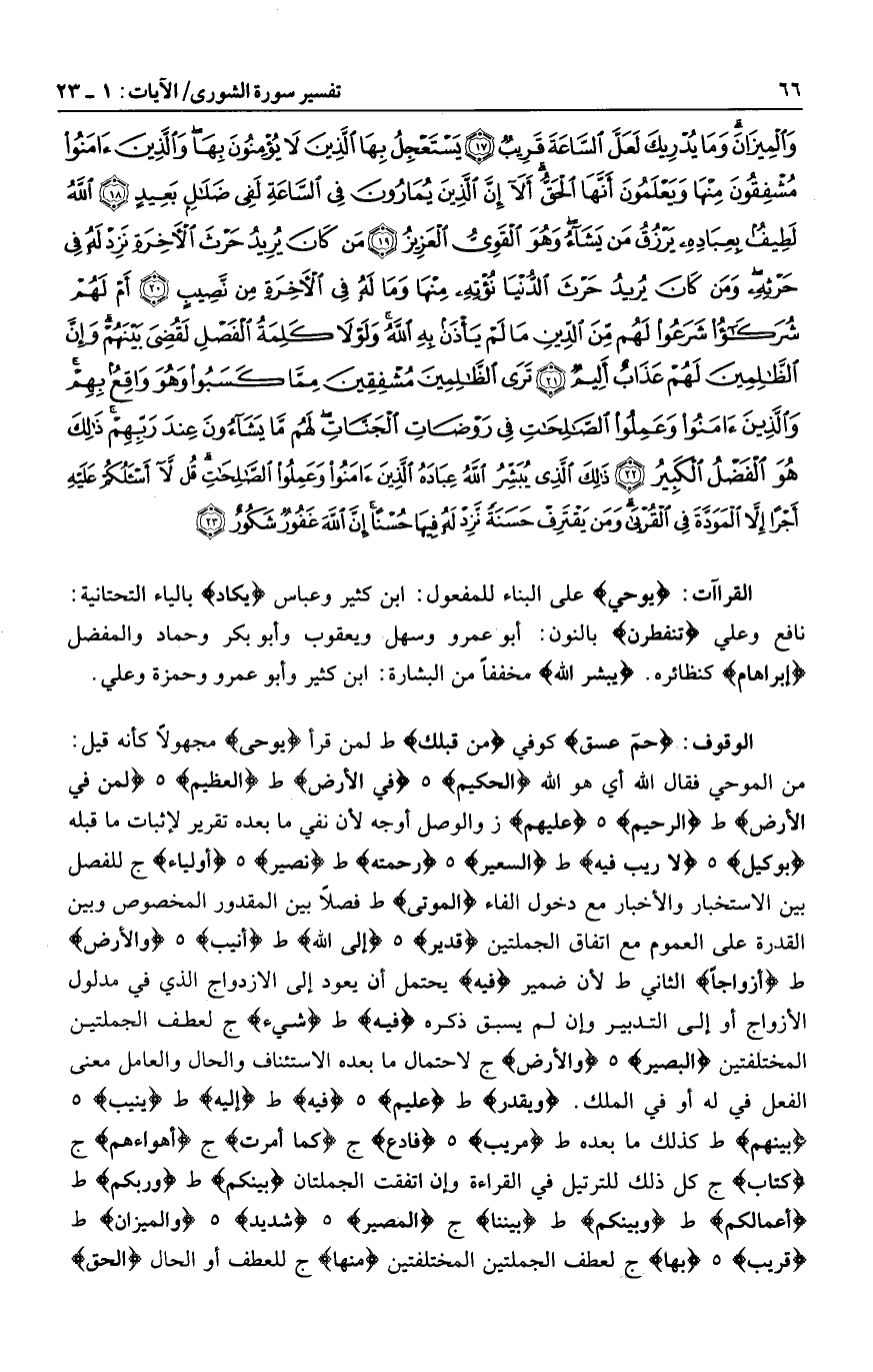 من الموحي فقال الله أي هو الله الْحَكِيمُ هـ فِي الْأَرْضِ ط الْعَظِيمُ هـ لِمَنْ فِي الْأَرْضِ ط الرَّحِيمُ هـ عَلَيْهِمْ ز والوصل أوجه لأن نفي ما بعده تقرير لإثبات ما قبله بِوَكِيلٍ هـ لا رَيْبَ فِيهِ ط السَّعِيرِ هـ رَحْمَتِهِ ط نَصِيرٍ هـ أَوْلِياءَ ج للفصل بين الاستخبار والأخبار مع دخول الفاء الْمَوْتى ط فصلا بين المقدور المخصوص وبين القدرة على العموم مع اتفاق الجملتين قَدِيرٌ هـ إِلَى اللَّهِ ط أُنِيبُ هـ وَالْأَرْضِ ط أَزْواجاً الثاني ط لأن ضمير فِيهِ يحتمل أن يعود إلى الأزواج الذي في مدلول الأزواج أو إلى التدبير وإن لم يسبق ذكره فِيهِ ط شَيْءٌ ج لعطف الجملتين المختلفتين الْبَصِيرُ هـ وَالْأَرْضِ ج لاحتمال ما بعده الاستئناف والحال والعامل معنى الفعل في له أو في الملك. وَيَقْدِرُ ط عَلِيمٌ هـ فِيهِ ط إِلَيْهِ ط يُنِيبُ هـ بَيْنَهُمْ ط كذلك ما بعده ط مُرِيبٍ هـ فَادْعُ ج كَما أُمِرْتَ ج أَهْواءَهُمْ ج كِتابٍ ج كل ذلك للترتيل في القراءة وإن اتفقت الجملتان بَيْنَكُمُ ط وَرَبُّكُمْ ط أَعْمالُكُمْ ط وَبَيْنَكُمُ ط بَيْنَنا ج الْمَصِيرُ هـ شَدِيدٌ هـ وَالْمِيزانَ ط قَرِيبٌ هـ بِهَا ج لعطف الجملتين المختلفتين مِنْها ج للعطف أو الحال الْحَقُّ