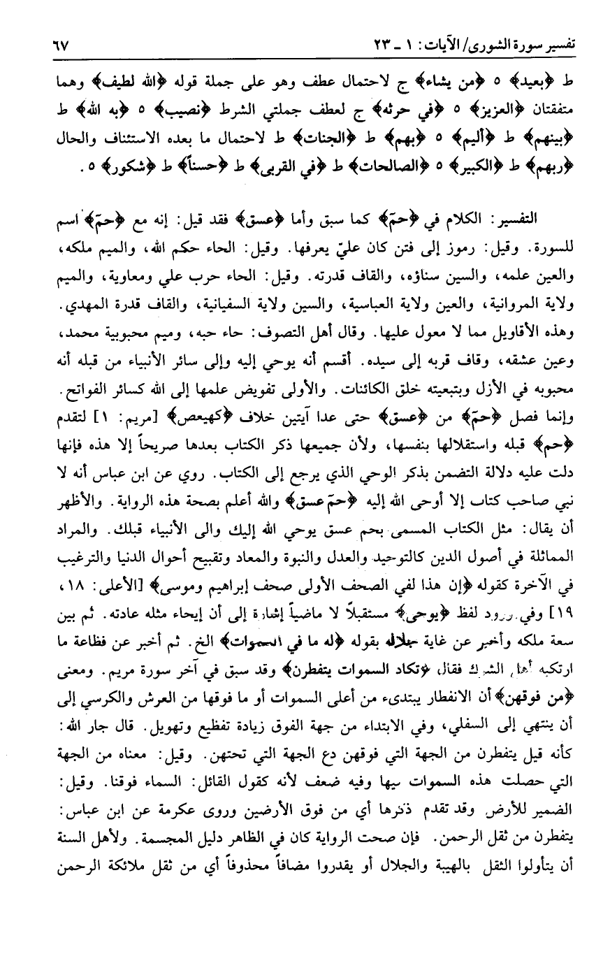 وإنما فصل حم من عسق حتى عدا آيتين خلاف كهيعص [مريم: 1] لتقدم حم قبله واستقلالها بنفسها، ولأن جميعها ذكر الكتاب بعدها صريحا إلا هذه فإنها دلت عليه دلالة التضمن بذكر الوحي الذي يرجع إلى الكتاب. روي عن ابن عباس أنه لا نبي صاحب كتاب إلا أوحى الله إليه حم عسق والله أعلم بصحة هذه الرواية. والأظهر أن يقال: مثل الكتاب المسمى بحم عسق يوحي الله إليك والى الأنبياء قبلك. والمراد المماثلة في أصول الدين كالتوحيد والعدل والنبوة والمعاد وتقبيح أحوال الدنيا والترغيب في الآخرة كقوله إِنَّ هذا لَفِي الصُّحُفِ الْأُولى صُحُفِ إِبْراهِيمَ وَمُوسى [الأعلى: 18، 19] وفي ورود لفظ يُوحِي مستقبلا لا ماضيا إشارة إلى أن إيحاء مثله عادته. ثم بين سعة ملكه وأخبر عن غاية جلاله بقوله لَهُ ما فِي السَّماواتِ إلخ. ثم أخبر عن فظاعة ما ارتكبه أهل الشرك فقال تَكادُ السَّماواتُ يَتَفَطَّرْنَ وقد سبق في آخر سورة مريم. ومعنى مِنْ فَوْقِهِنَّ أن الانفطار يبتدىء من أعلى السموات أو ما فوقها من العرش والكرسي إلى أن ينتهي إلى السفلي، وفي الابتداء من جهة الفوق زيادة تفظيع وتهويل. قال جار الله: