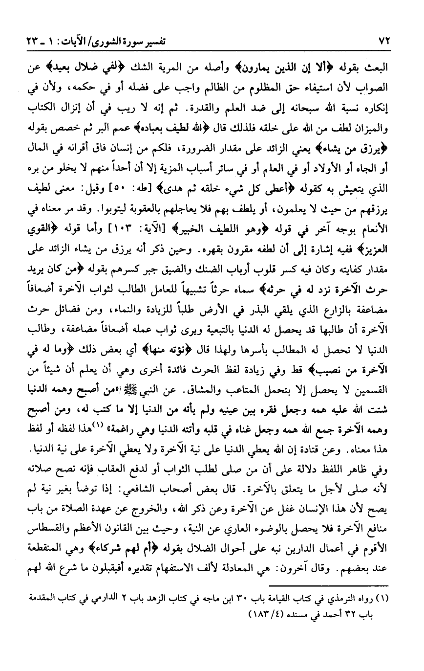 البعث بقوله أَلا إِنَّ الَّذِينَ يُمارُونَ وأصله من المرية الشك لَفِي ضَلالٍ بَعِيدٍ عن الصواب لأن استيفاء حق المظلوم من الظالم واجب على فضله أو في حكمه، ولأن في إنكاره نسبة الله سبحانه إلى ضد العلم والقدرة. ثم إنه لا ريب في أن إنزال الكتاب والميزان لطف من الله على خلقه فلذلك قال اللَّهُ لَطِيفٌ بِعِبادِهِ عمم البر ثم خصص بقوله يَرْزُقُ مَنْ يَشاءُ يعني الزائد على مقدار الضرورة، فلكم من إنسان فاق أقرانه في المال أو الجاه أو الأولاد أو في العلم أو في سائر أسباب المزية إلا أن أحدا منهم لا يخلو من بره الذي يتعيش به كقوله أَعْطى كُلَّ شَيْءٍ خَلْقَهُ ثُمَّ هَدى [طه: 50] وقيل: معنى لطيف يرزقهم من حيث لا يعلمون، أو يلطف بهم فلا يعاجلهم بالعقوبة ليتوبوا. وقد مر معناه في الأنعام بوجه آخر في قوله وَهُوَ اللَّطِيفُ الْخَبِيرُ [الآية: 103] وأما قوله الْقَوِيُّ الْعَزِيزُ ففيه إشارة إلى أن لطفه مقرون بقهره. وحين ذكر أنه يرزق من يشاء الزائد على مقدار كفايته وكان فيه كسر قلوب أرباب الضنك والضيق جبر كسرهم بقوله مَنْ كانَ يُرِيدُ حَرْثَ الْآخِرَةِ نَزِدْ لَهُ فِي حَرْثِهِ سماه حرثا تشبيها للعامل الطالب لثواب الآخرة أضعافا مضاعفة بالزارع الذي يلقي البذر في الأرض طلبا للزيادة والنماء، ومن فضائل حرث الآخرة أن طالبها قد يحصل له الدنيا بالتبعية ويرى ثواب عمله أضعافا مضاعفة، وطالب الدنيا لا تحصل له المطالب بأسرها ولهذا قال نُؤْتِهِ مِنْها أي بعض ذلك وَما لَهُ فِي الْآخِرَةِ مِنْ نَصِيبٍ قط وفي زيادة لفظ الحرث فائدة أخرى وهي أن يعلم أن شيئا من القسمين لا يحصل إلا بتحمل المتاعب والمشاق.