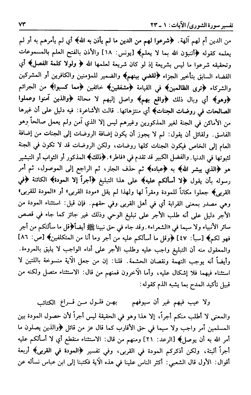 من الدين أم لهم آلهة. شَرَعُوا لَهُمْ مِنَ الدِّينِ ما لَمْ يَأْذَنْ بِهِ اللَّهُ أي لم يأمرهم به أو لم يعلمه كقوله أَتُنَبِّئُونَ اللَّهَ بِما لا يَعْلَمُ [يونس: 18] والأذن بالفتح العلم بالمسموعات وتحقيقه شرعوا ما ليس بشريعة إذ لو كان شريعة لعلمها الله وَلَوْلا كَلِمَةُ الْفَصْلِ أي القضاء السابق بتأخير الجزاء لَقُضِيَ بَيْنَهُمْ والضمير للمؤمنين والكافرين أو المشركين والشركاء تَرَى الظَّالِمِينَ في القيامة مُشْفِقِينَ خائفين مِمَّا كَسَبُوا من الجرائم وَهُوَ أي وبال ذلك واقِعٌ بِهِمْ واصل إليهم لا محالة وَالَّذِينَ آمَنُوا وَعَمِلُوا الصَّالِحاتِ فِي رَوْضاتِ الْجَنَّاتِ أي منتزهاتها. قالت الأشاعرة: فيه دليل على أن غيرها من الأماكن في الجنة لغير المذكورين وغيرهم ليس إلا الذي آمن ولم يعمل صالحا وهو الفاسق. ولقائل أن يقول: لم لا يجوز أن يكون إضافة الروضات إلى الجنات من إضافة العام إلى الخاص فيكون الجنات كلها روضات، ولكن الروضات قد لا تكون في الجنة لثبوتها في الدنيا. والفضل الكبير قد تقدم في «فاطر» . ذلِكَ المذكور أو الثواب أو التبشير هو الَّذِي يُبَشِّرُ اللَّهُ به عِبادَهُ ثم حذف الجار، ثم الراجع إلى الموصول، ثم أمر رسوله بأن يقول لا أَسْئَلُكُمْ عَلَيْهِ على هذا التبليغ أَجْراً إِلَّا الْمَوَدَّةَ الكائنة فِي الْقُرْبى جعلوا مكانا للمودة ومقرا لها ولهذا لم يقل «مودة القربى» أو «المودة للقربى» وهي مصدر بمعنى القرابة أي في أهل القربى وفي حقهم. فإن قيل: استثناء المودة من الأجر دليل على أنه طلب الأجر على تبليغ الوحي وذلك غير جائز كما جاء في قصص سائر الأنبياء ولا سيما في «الشعراء» . وقد جاء في حق نبينا صلى الله عليه وسلم أيضا قُلْ ما سَأَلْتُكُمْ مِنْ أَجْرٍ فَهُوَ لَكُمْ [سبأ: 47] وقُلْ ما أَسْئَلُكُمْ عَلَيْهِ مِنْ أَجْرٍ وَما أَنَا مِنَ الْمُتَكَلِّفِينَ [ص: 86] والمعقول منه أن التبليغ واجب عليه وطلب الأجر على أداء الواجب لا يليق بالمروءة.