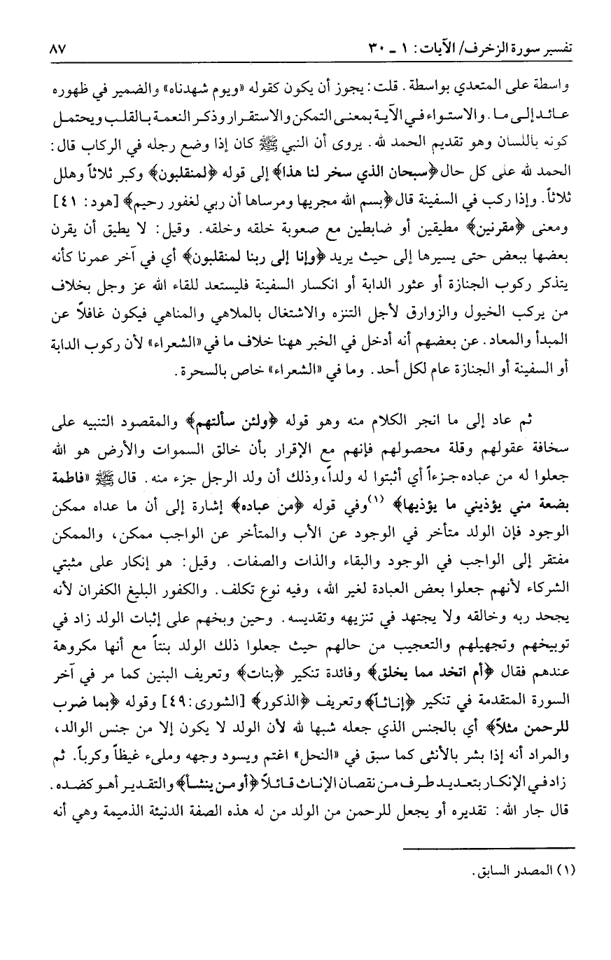 ثم عاد إلى ما انجر الكلام منه وهو قوله وَلَئِنْ سَأَلْتَهُمْ والمقصود التنبيه على سخافة عقولهم وقلة محصولهم فإنهم مع الإقرار بأن خالق السموات والأرض هو الله جعلوا له من عباده جزءا أي أثبتوا له ولدا، وذلك أن ولد الرجل جزء منه.