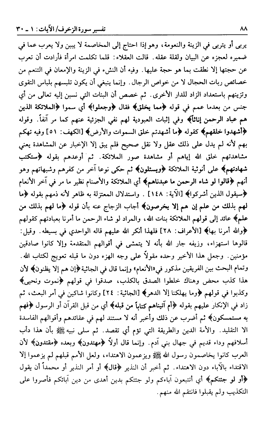 وتمام البحث بين الفريقين مذكور في «الأنعام» وإنما قال في الجاثية إِنْ هُمْ إِلَّا يَظُنُّونَ لأن هذا كذب محض وهناك خلطوا الصدق بالكذب، صدقوا في قولهم نَمُوتُ وَنَحْيا وكذبوا في قولهم وَما يُهْلِكُنا إِلَّا الدَّهْرُ [الجاثية: 24] وكانوا شاكين في أمر البعث، ثم زاد في الإنكار عليهم بقوله أَمْ آتَيْناهُمْ كِتاباً مِنْ قَبْلِهِ أي من قبل القرآن أو الرسول فَهُمْ بِهِ مُسْتَمْسِكُونَ ثم أضرب عن ذلك وأخبر أنه لا مستند لهم في عقائدهم وأقوالهم الفاسدة الا التقليد. والأمة الدين والطريقة التي تؤم أي تقصد. ثم سلى نبيه صلى الله عليه وسلم بأن هذا دأب أسلافهم وداء قديم في جهال بني آدم. وإنما قال أولا مُهْتَدُونَ وبعده مُقْتَدُونَ لأن العرب كانوا يخاصمون رسول الله صلى الله عليه وسلم ويزعمون الاهتداء، ولعل الأمم قبلهم لم يزعموا إلا الاقتداء بالآباء دون الاهتداء. ثم أخبر أن النذير قالَ أو أمر النذير أو محمدا أن يقول أَوَلَوْ جِئْتُكُمْ أي أتتبعون آباءكم ولو جئتكم بدين أهدى من دين آبائكم فأصروا على التكذيب ولم يقبلوا فانتقم الله منهم.