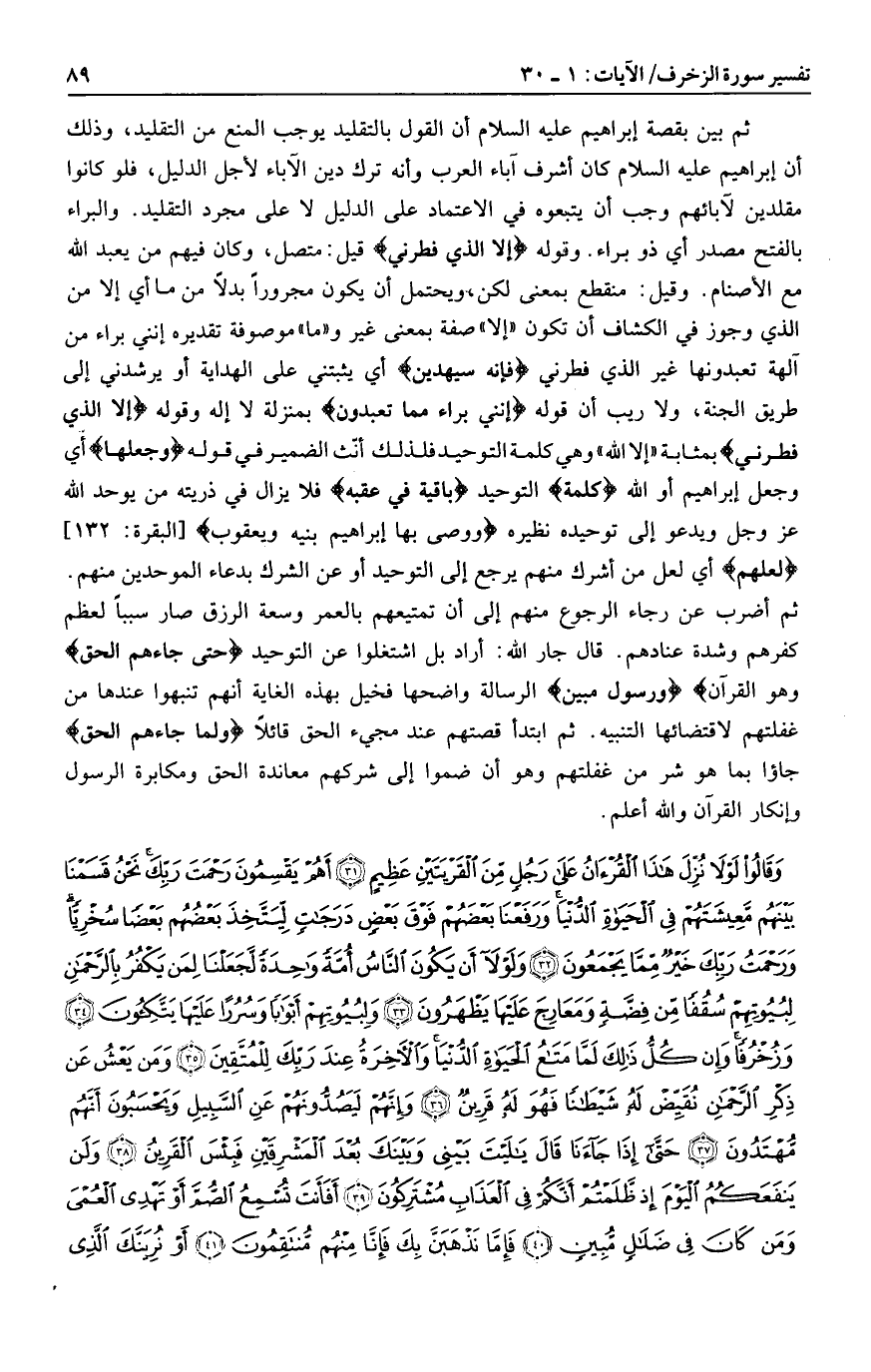 ثم بين بقصة إبراهيم عليه السلام أن القول بالتقليد يوجب المنع من التقليد، وذلك أن إبراهيم عليه السلام كان أشرف آباء العرب وأنه ترك دين الآباء لأجل الدليل، فلو كانوا مقلدين لآبائهم وجب أن يتبعوه في الاعتماد على الدليل لا على مجرد التقليد. والبراء بالفتح مصدر أي ذو براء. وقوله إِلَّا الَّذِي فَطَرَنِي قيل: متصل، وكان فيهم من يعبد الله مع الأصنام. وقيل: منقطع بمعنى لكن، ويحتمل أن يكون مجرورا بدلا من ما أي إلا من الذي وجوز في الكشاف أن تكون «إلا» صفة بمعنى غير و «ما» موصوفة تقديره إنني براء من آلهة تعبدونها غير الذي فطرني فَإِنَّهُ سَيَهْدِينِ أي يثبتني على الهداية أو يرشدني إلى طريق الجنة، ولا ريب أن قوله إِنَّنِي بَراءٌ مِمَّا تَعْبُدُونَ بمنزلة لا إله وقوله إِلَّا الَّذِي فَطَرَنِي بمثابة «إلا الله» وهي كلمة التوحيد فلذلك أنّث الضمير في قوله وَجَعَلَها أي وجعل إبراهيم أو الله كَلِمَةً التوحيد باقِيَةً فِي عَقِبِهِ فلا يزال في ذريته من يوحد الله عز وجل ويدعو إلى توحيده نظيره وَوَصَّى بِها إِبْراهِيمُ بَنِيهِ وَيَعْقُوبُ [البقرة: 132] لَعَلَّهُمْ أي لعل من أشرك منهم يرجع إلى التوحيد أو عن الشرك بدعاء الموحدين منهم.