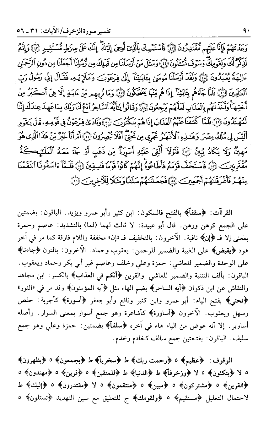 عَظِيمٍ هـ رَحْمَتَ رَبِّكَ ط سُخْرِيًّا ط يَجْمَعُونَ هـ يَظْهَرُونَ هـ لا يَتَّكِؤُنَ هـ لا وَزُخْرُفاً ط الدُّنْيا ط لِلْمُتَّقِينَ هـ قَرِينٌ هـ مُهْتَدُونَ هـ الْقَرِينُ هـ مُشْتَرِكُونَ هـ مُبِينٍ هـ مُنْتَقِمُونَ هـ لا مُقْتَدِرُونَ هـ إِلَيْكَ ط لاحتمال التعليل مُسْتَقِيمٍ هـ وَلِقَوْمِكَ ج للتعليق مع سين التهديد تُسْئَلُونَ هـ