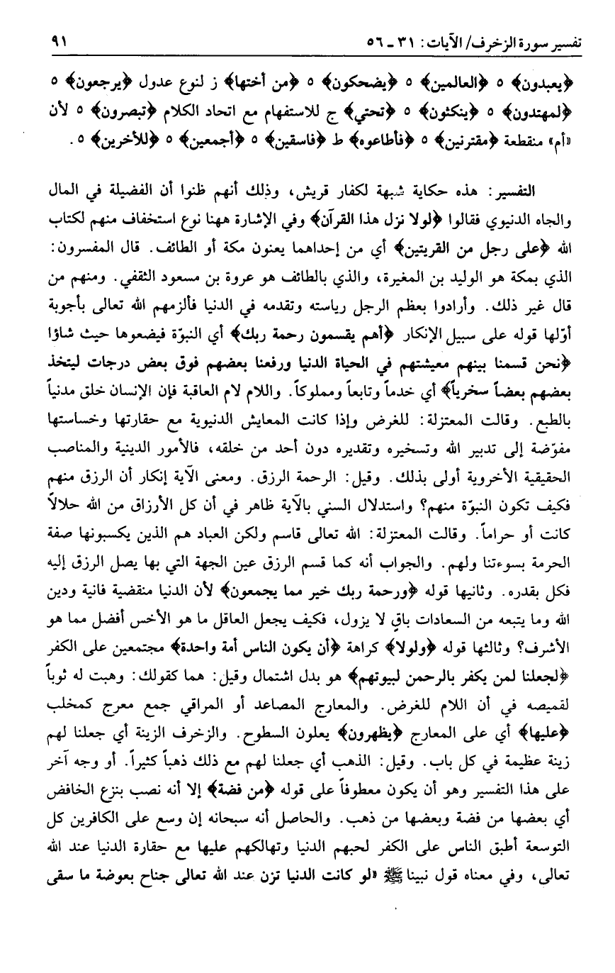 الذي بمكة هو الوليد بن المغيرة، والذي بالطائف هو عروة بن مسعود الثقفي. ومنهم من قال غير ذلك. وأرادوا بعظم الرجل رياسته وتقدمه في الدنيا فألزمهم الله تعالى بأجوبة أوّلها قوله على سبيل الإنكار أَهُمْ يَقْسِمُونَ رَحْمَتَ رَبِّكَ أي النبوّة فيضعوها حيث شاؤا نَحْنُ قَسَمْنا بَيْنَهُمْ مَعِيشَتَهُمْ فِي الْحَياةِ الدُّنْيا وَرَفَعْنا بَعْضَهُمْ فَوْقَ بَعْضٍ دَرَجاتٍ لِيَتَّخِذَ بَعْضُهُمْ بَعْضاً سُخْرِيًّا أي خدما وتابعا ومملوكا. واللام لام العاقبة فإن الإنسان خلق مدنيا بالطبع. وقالت المعتزلة: للغرض وإذا كانت المعايش الدنيوية مع حقارتها وخساستها مفوّضة إلى تدبير الله وتسخيره وتقديره دون أحد من خلقه، فالأمور الدينية والمناصب الحقيقية الأخروية أولى بذلك. وقيل: الرحمة الرزق. ومعنى الآية إنكار أن الرزق منهم فكيف تكون النبوّة منهم؟ واستدلال السني بالآية ظاهر في أن كل الأرزاق من الله حلالا كانت أو حراما. وقالت المعتزلة: الله تعالى قاسم ولكن العباد هم الذين يكسبونها صفة الحرمة بسوءتنا ولهم. والجواب أنه كما قسم الرزق عين الجهة التي بها يصل الرزق إليه فكل بقدره. وثانيها قوله وَرَحْمَتُ رَبِّكَ خَيْرٌ مِمَّا يَجْمَعُونَ لأن الدنيا منقضية فانية ودين الله وما يتبعه من السعادات باق لا يزول، فكيف يجعل العاقل ما هو الأخس أفضل مما هو الأشرف؟ وثالثها قوله وَلَوْلا كراهة أَنْ يَكُونَ النَّاسُ أُمَّةً واحِدَةً مجتمعين على الكفر لَجَعَلْنا لِمَنْ يَكْفُرُ بِالرَّحْمنِ لِبُيُوتِهِمْ هو بدل اشتمال وقيل: هما كقولك: وهبت له ثوبا لقميصه في أن اللام للغرض. والمعارج المصاعد أو المراقي جمع معرج كمخلب عَلَيْها أي على المعارج يَظْهَرُونَ يعلون السطوح. والزخرف الزينة أي جعلنا لهم زينة عظيمة في كل باب. وقيل: الذهب أي جعلنا لهم مع ذلك ذهبا كثيرا. أو وجه آخر على هذا التفسير وهو أن يكون معطوفا على قوله مِنْ فِضَّةٍ إلا أنه نصب بنزع الخافض أي بعضها من فضة وبعضها من ذهب. والحاصل أنه سبحانه إن وسع على الكافرين كل التوسعة أطبق الناس على الكفر لحبهم الدنيا وتهالكهم عليها مع حقارة الدنيا عند الله تعالى، وفي معناه
