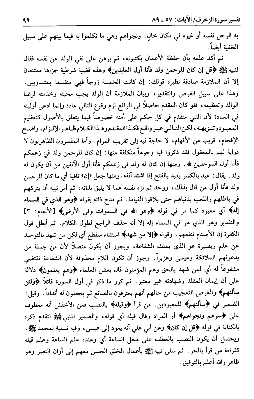 وهذا على سبيل الفرض والتقدير، وبيان الملازمة أن الولد يجب محبته وخدمته لرضا الوالد وتعظيمه، فلو كان المقدم حاصلا في الواقع لزم وقوع التالي عادة وإنما ادعى أوليته في العبادة لأن النبي متقدم في كل حكم على أمته خصوصا فيما يتعلق بالأصول كتعظيم المعبود وتنزيهه، لكن التالي غير واقع فكذا المقدم وهذا الكلام ظاهر الإلزام، واضح الإفحام، قريب من الأفهام، لا حاجة فيه إلى تقريب المرام. وأما المفسرون الظاهريون لا دراية لهم بالمعقول فقد ذكروا فيه وجوها متكلفة منها: إن كان للرحمن ولد في زعمكم فأنا أول الموحدين لله. ومنها إن كان له ولد في زعمكم فأنا أول الآنفين من أن يكون له ولد. يقال: عبد بالكسر يعبد بالفتح إذا اشتد أنفه. ومنها جعل «إن» نافية أي ما كان للرحمن ولد فأنا أول من قال بذلك، ووحد ثم نزه نفسه عما لا يليق بذاته، ثم أمر نبيه أن يتركهم في باطلهم واللعب بدنياهم حتى يلاقوا القيامة. ثم مدح ذاته بقوله وَهُوَ الَّذِي فِي السَّماءِ إِلهٌ أي معبود كما مر في قوله وَهُوَ اللَّهُ فِي السَّماواتِ وَفِي الْأَرْضِ [الأنعام: 3] والتقدير وهو الذي هو في السماء إله إلا أنه حذف الراجع لطول الكلام. ثم أبطل قول الكفرة إن الأصنام تنفعهم. وقوله إِلَّا مَنْ شَهِدَ استثناء منقطع أي لكن من شهد بالتوحيد عن علم وبصيرة هو الذي يملك الشفاعة، ويجوز أن يكون متصلا لأن من جملة من يدعونهم الملائكة وعيسى وعزيزا. وجوز أن تكون اللام محذوفة لأن الشفاعة تقتضي مشفوعا له أي لمن شهد بالحق وهم المؤمنون قال بعض العلماء وَهُمْ يَعْلَمُونَ دلالة على أن إيمان المقلد وشهادته غير معتبر. ثم كرر ما ذكر في أول السورة قائلا وَلَئِنْ سَأَلْتَهُمْ والغرض التعجيب من حالهم أنهم يعترفون بالصانع ثم يجعلون له أندادا. وقيل:
