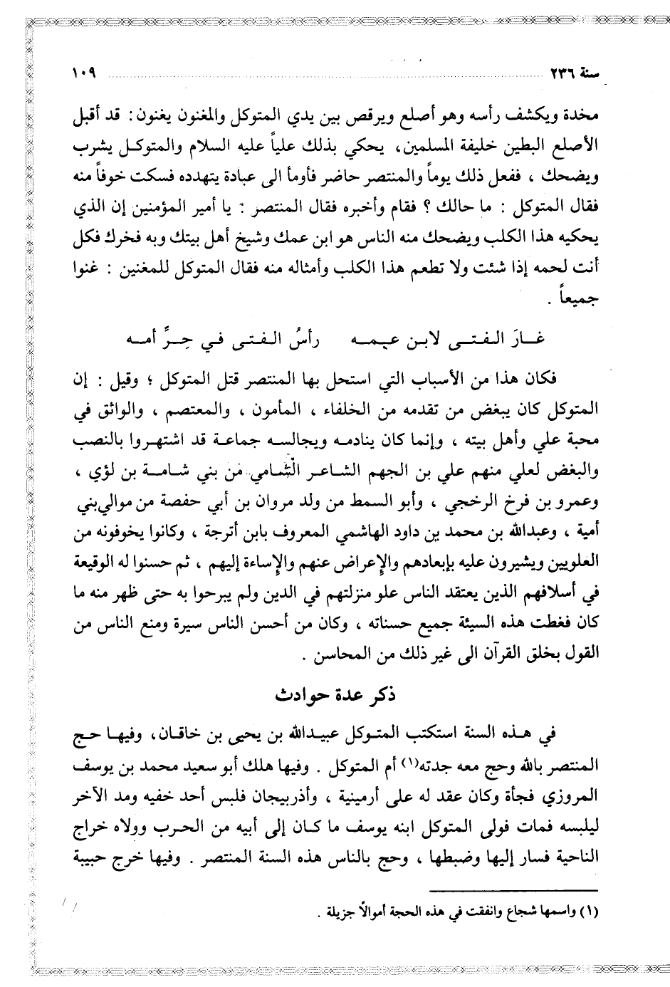 مخدة ويكشف رأسه وهو أصلع ويرقص بين يدي المتوكل والمغنون يغنون قد أقبل الأصلع البدين خليفة المسلمين يحكي بذلك عليا عليه السلام والمتوكل يشرب ويضحك ففعل ذلك يوما والمنتصر حاضر فأومأ إلى عبادة يتهدده فسكت خوفا منه فقال المتوكل ما حالك فقام وأخبره فقال المنتصر يا أمير المؤمنين إن الذي يحكيه هذا الكلب ويضحك منه الناس هو ابن عمك وشيخ أهل بيتك وبه فخرك فكل أنت لحمه إذا شئت ولا تطعم هذا الكلب وأمثال منه فقال المتوكل للمغنين غنوا جميعا