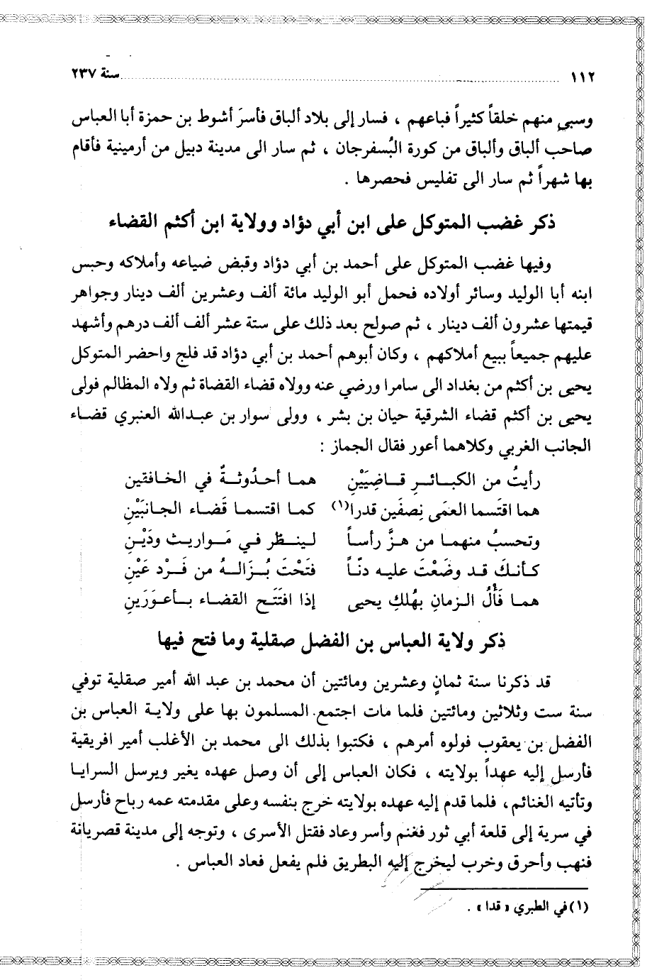 وفيها غضب المتوكل على أحمد بن أبي دؤاد وقبض ضياعه وأملاكه وحبس ابنه أبا الوليد وسائر أولاده فحمل أبو الوليد مائة ألف وعشرين ألف دينار وجواهر قيمتها عشرون ألف دينار ثم صولح بعد ذلك على ستة عشر ألف ألف درهم وأشهد عليهم جميعا بيع أملاكهم وكان أبوهم أحمد بن أبي دؤاد قد فلج و أحضر المتوكل يحيى بن أكثم من بغداد إلى سامرا ورضي عنه وولاه قضاء القضاة ثم ولاه المظالم فولى يحيى بن أكثم قضاء الشرقية حيان بن بشر وولى سوار بن عبد الله العنبري قضاء الجانب الغربي وكلاهما أعور فقال الجماز