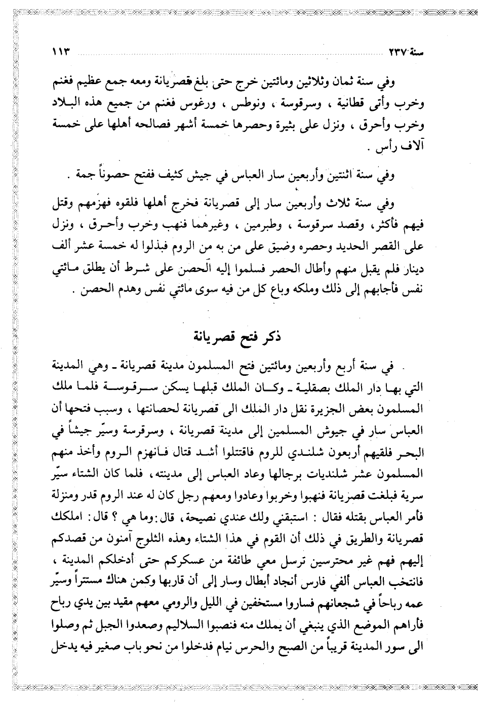 وفي سنة ثلاث وأربعين سار إلى قصريانة فخرج أهلها فلقوه فهزمهم وقتل فيهم فأكثر وقصد سرقوسة وطبرمين وغيرهما فنهب وخرب وأحرق ونزل على القصر الحديد وحصره وضيق على من به من الروم فبذلوا له خمسة عشر ألف دينار فلم يقبل منهم وأطال الحصر فسلموا إليه الحصن على شرط أن يطلق مائتي نفس فأجابهم إلى ذلك وملكه وباع كل من فيه سوى مائتي نفس وهدن الحصن
