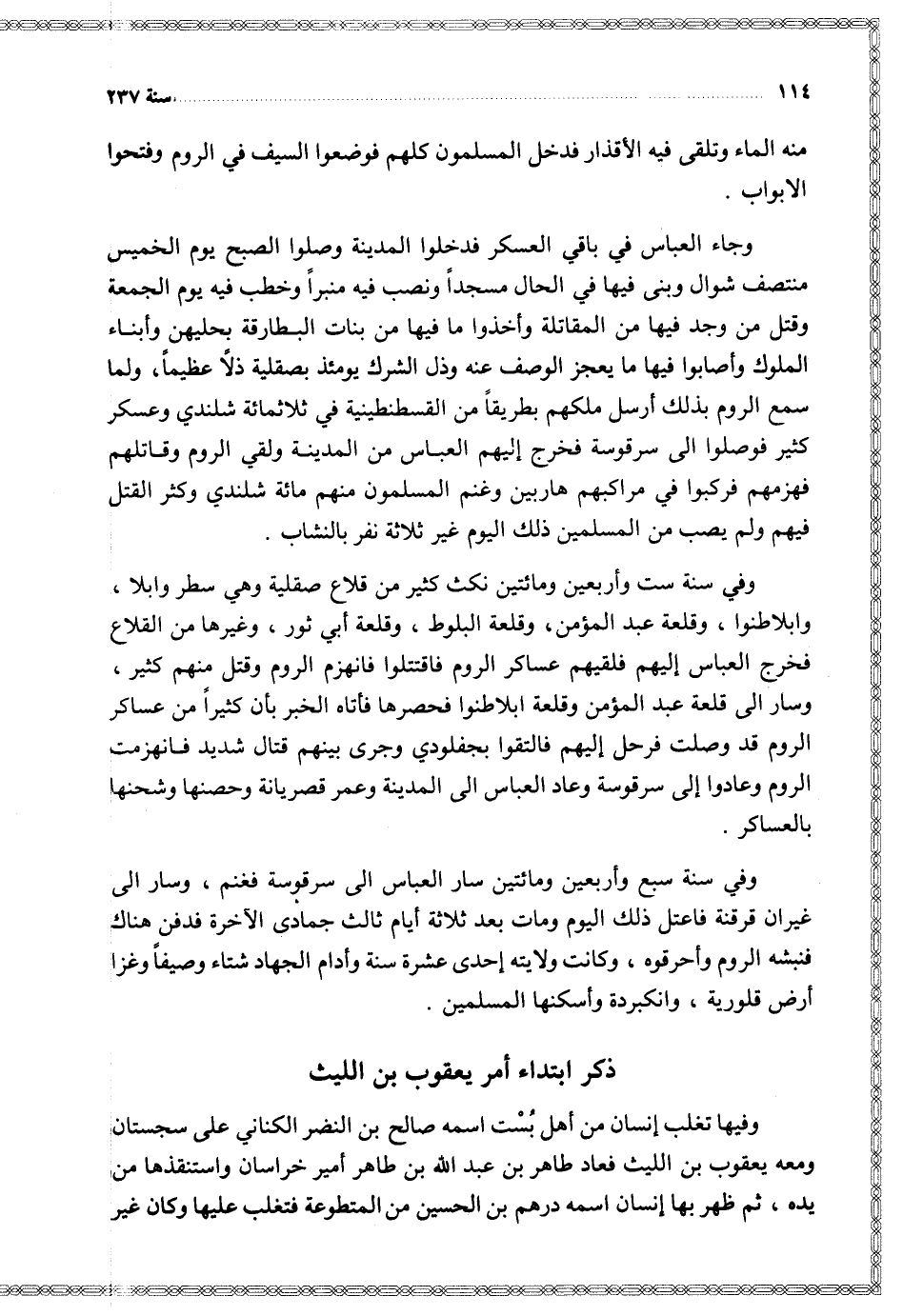 وجاء العباس في باقي العسكر فدخلوا المدينة وصلوا الصبح يوم الخميس منتصف شوال وبنى فيها في الحال مسجدا ونصب فيه منبرا وخطب فيه يوم الجمعة وقتل من وجد فيها من المقاتلة وأخذوا ما فيها من بنات البطارقة بحليهن وأبناء الملوك وأصابوا فيها ما يعجز الوصف عنه وذل الشرك يومئذ بصقلية ذلا عظيما ولما سمع الروم بذلك أرسل ملكهم بطريقا من القسطنطينية في ثلاثمائة شلندي وعسكر كثير فوصلوا إلى سرقوسة فخرج إليهم العباس من المدينة ولقي الروم وقاتلهم فهزمهم فركبوا في مراكبهم هاربين وغنم المسلمون منهم مائة شلندي وكثر القتل فيهم ولم يصب من المسلمين ذلك اليوم غير ثلاثة نفر النشاب