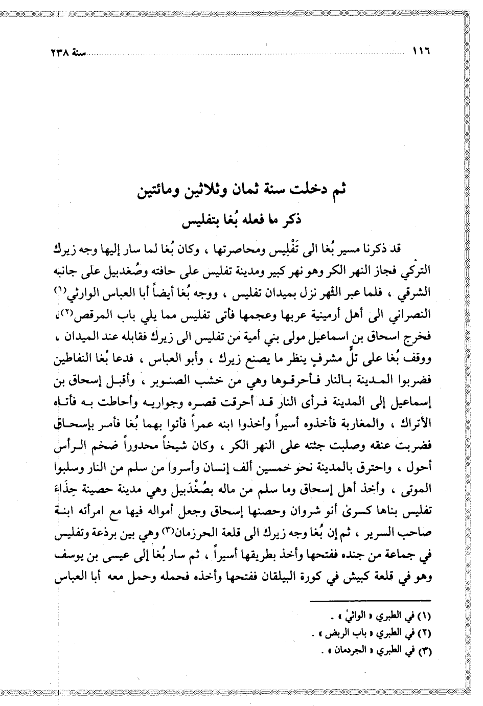 قد ذكرنا مسير بغا إلى تفليس ومحاصرتها وكان بغا لما سار إليها وجه زيرك التركي فجاز النهر الكر وهو نهر كبير ومدينة تفليس على حافته وصغدبيل على جانبه الشرقي فلما عبر النهر نزل بميدان تفليس ووجه بغا أيضا أبا العباس الوارثي النصراني إلى أهل أرمينية عربها وعجمها فأتى تفليس مما يلي باب المرقص فخرج إسحاق بن إسماعيل مولى بني أمية من تفليس إلى زيرك فقابله عند الميدان ووقف بغا على تل مشرف ينظر ما يصنع زيرك وأبو العباس فدعا بغا النفاطين فضربوا المدينة بالنار فأحرقوها وهي من خشب الصنوبر وأقبل إسحاق بن إسماعيل إلى المدينة فرأى النار قد أحرقت قصره وجواريه وأحاطت به فأتاه الأتراك والمغاربة فأخذوه أسيرا وأخذوا ابنه عمرا فأتوا بهما بغا فأمر بإسحاق فضربت عنقه وصلبت جثته على النهر الكر وكان شيخا محدورا ضخم الرأس أحول واحترق بالمدينة نحو خمسين ألف إنسان وأسروا من سلم من النار وسلبوا الموتى وأخذ أهل إسحاق وما سلم من ماله بصغدبيل وهي مدينة حصينة حذاء تفليس بناها كسرى أنوشروان وحصنها إسحاق وجعل أمواله فيها مع امرأته ابنة صاحب السرير ثم إن بغا وجه زيرك إلى قلعة الحرزمان وهي بين برذعة وتفليس في جماعة من جنده ففتحها وأخذ بطريقها أسيرا ثم سار بغا إلى عيسى بن يوسف وهو في قلعة كبيش في كورة البيلقان ففتحها وأخذه فحمله وحمل معه أبا العباس
