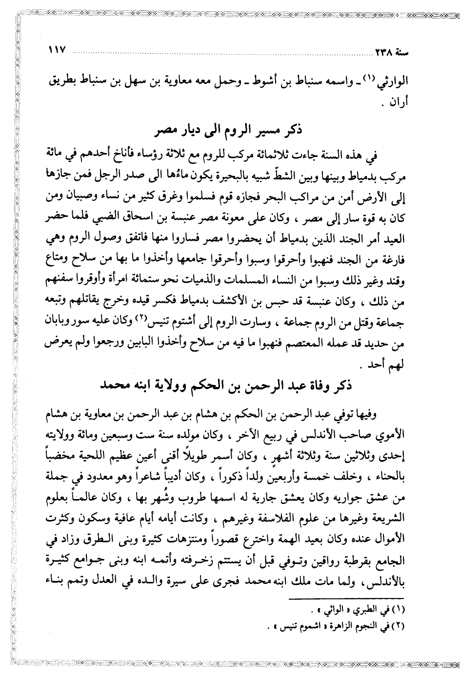وفيها توفي عبد الرحمن بن الحكم بن هشام بن عبد الرحمن بن معاوية بن هشام الأموي صاحب الأندلس في ربيع الأول وكان مولده سنة ست وسبعين ومائة وولايته إحدى وثلاثين سنة وثلاثة أشهر وكان أسمر طويلا أقنى أعين عظيم اللحية مخضبا بالحناء وخلف خمسة وأربعين ولدا ذكورا وكان أديبا شاعرا وهو معدود في جملة من عشق جواريه وكان يعشق جارية له اسمها طروب وشهر بها وكان عالما بعلوم الشريعة وغيرها من علوم الفلاسفة وغيرهم وكانت أيامه عافية وسكون وكثرت الأموال عنده وكان بعيد الهمة واخترع قصورا ومنتزهات كثيرة وبنى الطرق وزاد في الجامع بقرطبة رواقين وتفي قبل أن يستتم زخرفته وأتمه ابنه وبنى جوامع كثيرة بالأندلس ولما مات ملك ابنه محمد فجرى على سيرة والده في العدل وتمم بناء