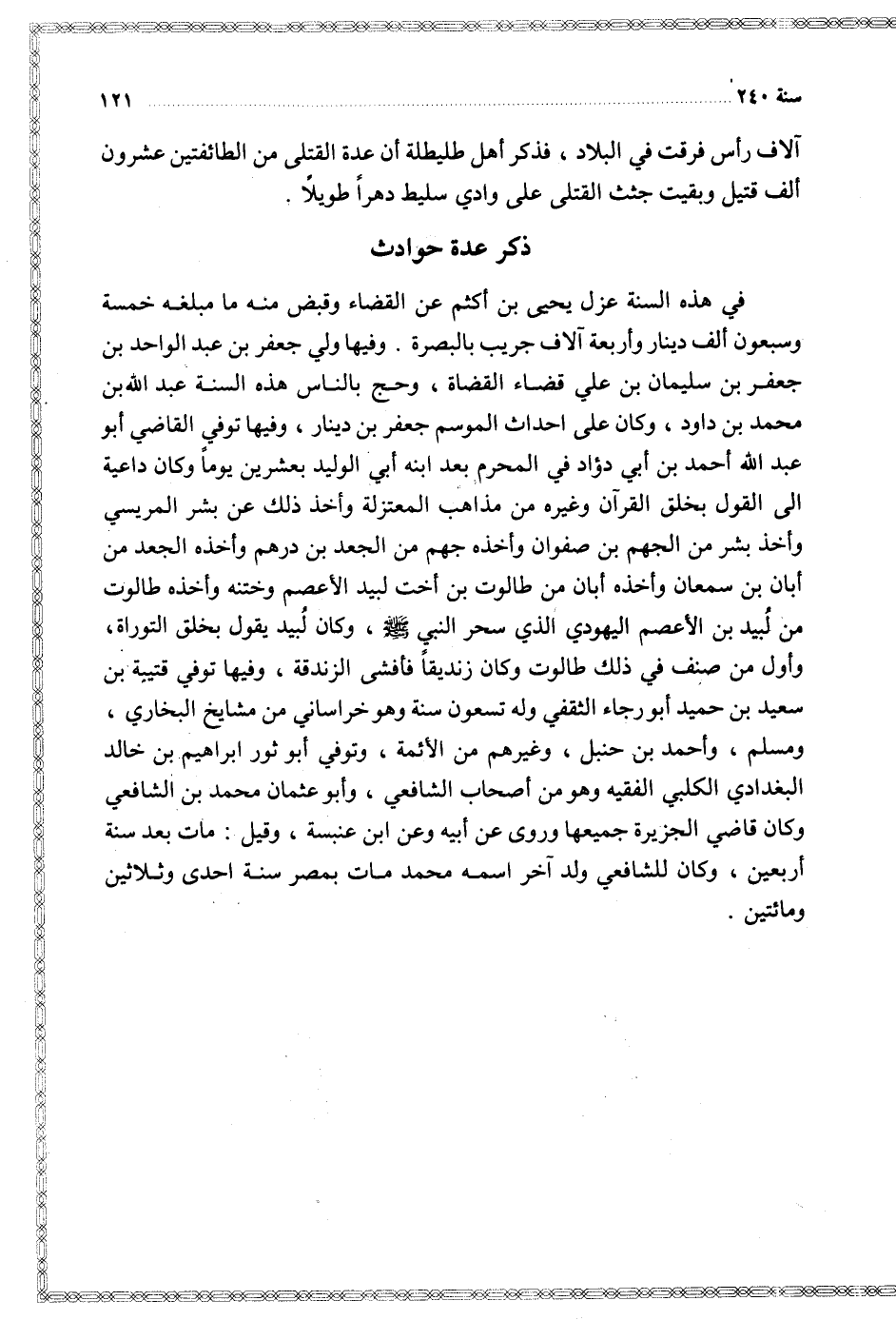 وفيها ولي جعفر بن عبد الواحد بن جعفر بن سليمان بن علي قضاء القضاة وحج بالناس هذه السنة عبد الله بن محمد بن داود وكان على احداث الموسم جعفر بن دينار وفيها توفي القاضي أبو عبد الله أحمد بن أبي دؤاد في المحرم بعد ابنه أبي الوليد بعشرين يوما وكان داعية إلى القول بخلق القرآن وغيره من مذاهب المعتزلة وأخذ ذلك عن بشر المريسي وأخذ بشر من الجهم بن صفوان وأخذه جهم من الجعد بن درهم وأخذه الجعد من أبان بن سمعان وأخذه أبان من طالوت بن أخت لبيد الأعصم وختنه وأخذه طالوت من لبيد بن الأعصم اليهودي الذي سحر النبي وكان لبيد يقول بخلق التوراة وأول نم صنف في ذلك طالوت وكان زنديقا فأفشى الزندقة وفيها توفي قتيبة بن سعيد بن حميد أبو رجاء الثقفي وله تسعون سنة وهو خراساني من مشايخ البخاري ومسلم وأحمد بن حنبل وغيرهم من الأئمة وتوفي أبو ثور إبراهيم بن خالد البغدادي الكلبي الفقيه وهو من أصحاب الشافعي وأبو عثمان محمد بن الشافعي وكان قاضي الجزيرة جميعها وروى عن أبيه وعن ابن عنبسة وقيل مات بعد سنة أربعين وكان للشافعي ولد آخر اسمه محمد مات بمصر سنة إحدى وثلاثين ومائتين