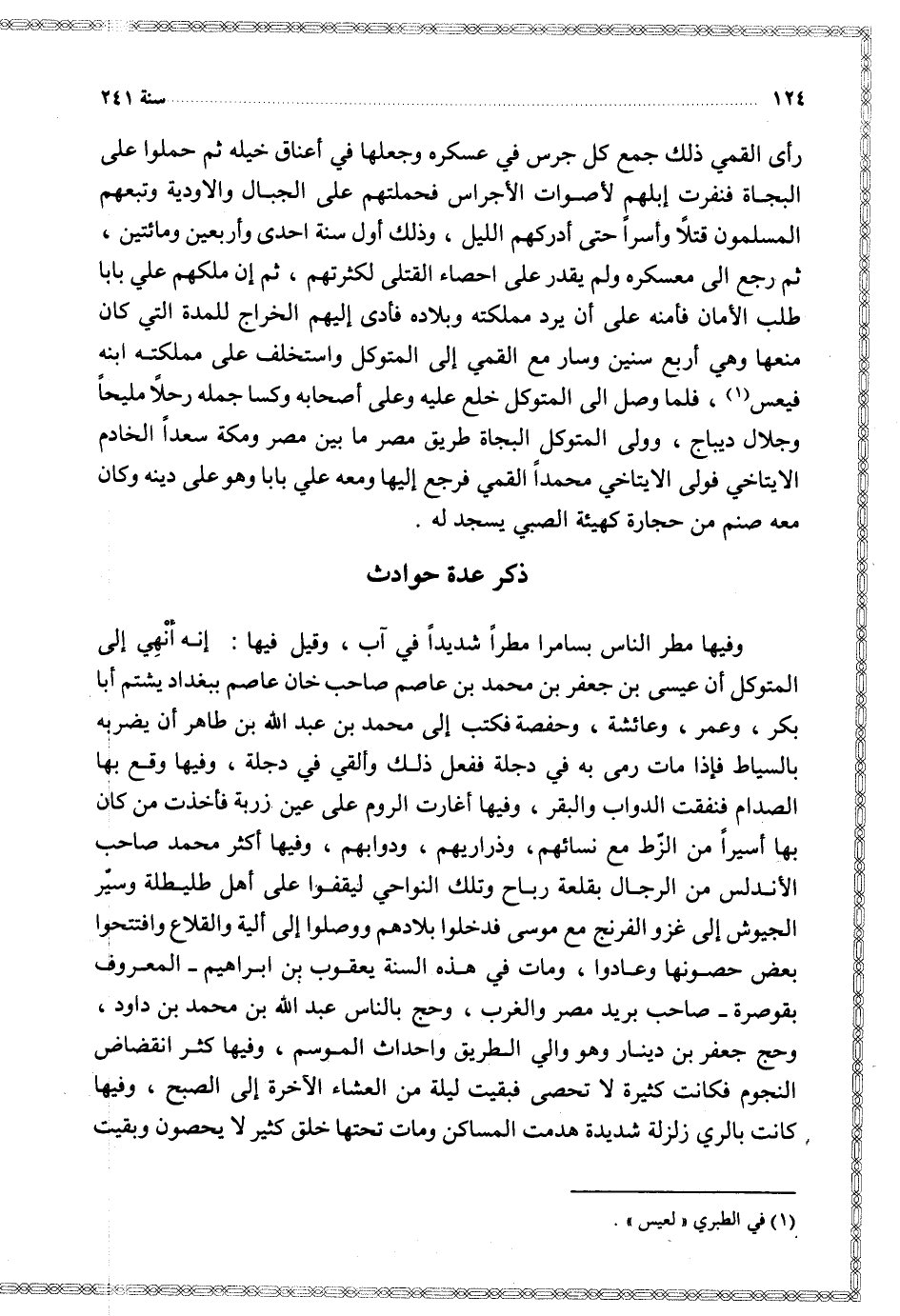 وفيها مطر الناس بسامرا مطرا شديدا في آب وقيل فيها إنه أنهي إلى المتوكل أن عيسى بن جعفر بن محمد بن عاصم صاحب خان عاصم ببغداد يشتم أبا بكر وعمر وعائشة وحفصة فكتب إلى محمد بن عبد الله بن طاهر أن يضربه بالسياط فإذا مات رمى به في دجلة ففعل ذلك وألقي في دجلة وفيها وقع بها الصدام فنفقت الدواب والبقر وفيها أغارت الروم على عين زربة فأخذت من كان بها أسيرا من الزط مع نسائهم وذراريهم ودوابهم وفيها أكثر محمد صاحب الأندلس من الرجال بقلعة رباح وتلك النواحي ليقفوا على أهل طليطلة وسير الجيوش إلى غزو الفرنج مع موسى فدخلوا بلادهم ووصلوا إلى ألية والقلاع وافتتحوا بعض حصونها وعادوا ومات في هذه السنة يعقوب بن إبراهيم المعروف بقوصرة صاحب بريد مصر والغرب وحج بالناس عبد الله بن محمد بن داود وحج جعفر بن دينار وهو والي الطريق واحداث الموسم وفيها كثر انقضاض النجوم فكانت كثيرة لا تحصى فبقيت ليلة من العشاء الآخرة إلى الصبح وفيها كانت بالري زلزلة شديدة هدمت المساكن ومات تحتها خلق كثير لا يحصون وبقيت