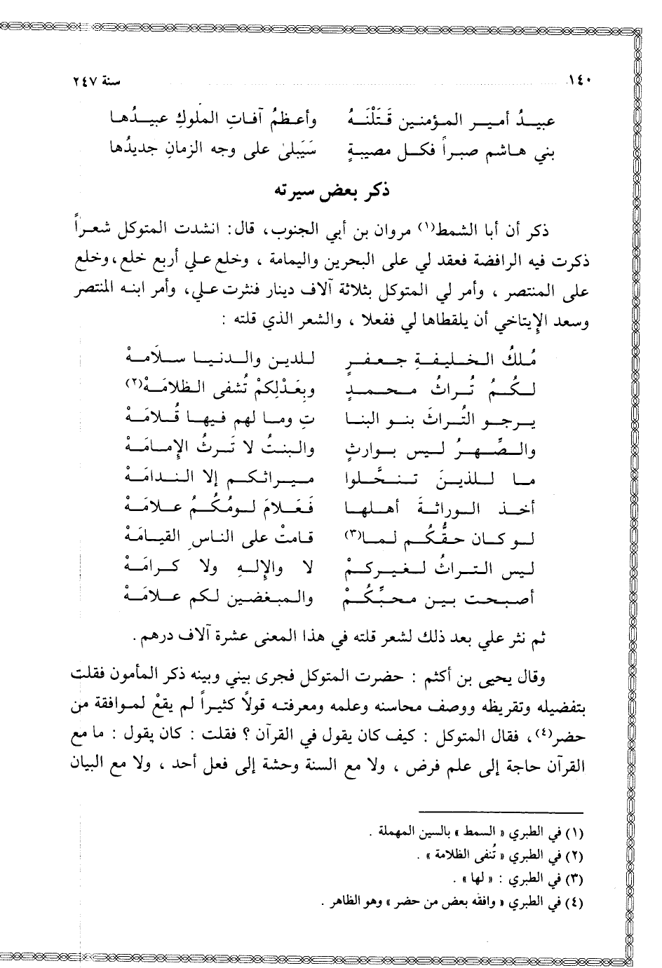 - ذكر أن أبا الشمط مروان بن أبي الجنوب قال أنشدت المتوكل شعرا ذكرت في الرافضة فعقد لي على البحرين واليمامة وخلع علي أربع خلع وخلع على المنتصر وأمر لي المتوكل بثلاثة آلاف دينار فنثرت علي وأمر ابنه المنتصر وسعد الإيتاخي أن يلقطاها لي ففعلا والشعر الذي قلته