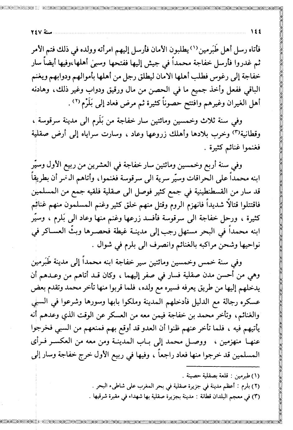 وفي سنة ثلاث وخمسين ومائتين سار خفاجة من بلرم إلى مدينة سرقوسة وقطانية وخرب بلادها وأهلك زروعها وعاد وسارت سراياه إلى أرض صقلية فغنموا غنائم كثيرة