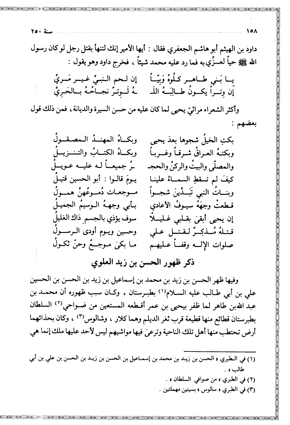 وفيها ظهر الحسن بن زيد بن محمد بن إسماعيل بن زيد بن الحسن بن الحسين علي بن أبي طالب عليه السلام بطبرستان وكان سبب ظهوره أن محمد بن عبد الله بن طاهر لما ظفر بيحيى بن عمر أقطعه المستعين من ضواحي السلطان بطبرستان قطائع منها قطيعة قرب ثغر الديلم وهما كلار وشالوس وكان بحذائهما أرض تحتطب منها أهل تلك الناحية وترعى فيها مواشيهم ليس لأحد عليها ملك إنما هي