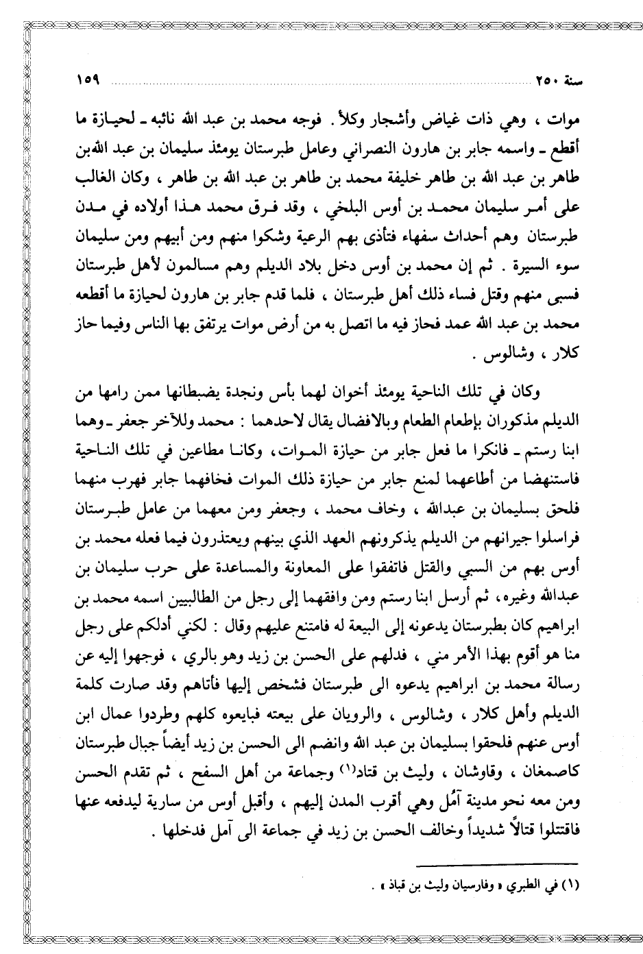 ثم إن محمد بن أوس دخل بلاد الديلم وهم مسالمون لأهل طبرستان فسبى منهم وقتل فساء ذلك أهل طبرستان فلما قدم جابر بن هارون لحيازة ما أقطعه محمد بن عبد الله عمد فحاز فيه ما اتصل به من أرض موات يرتفق بها الناس وفيما حاز كلار وشالوس