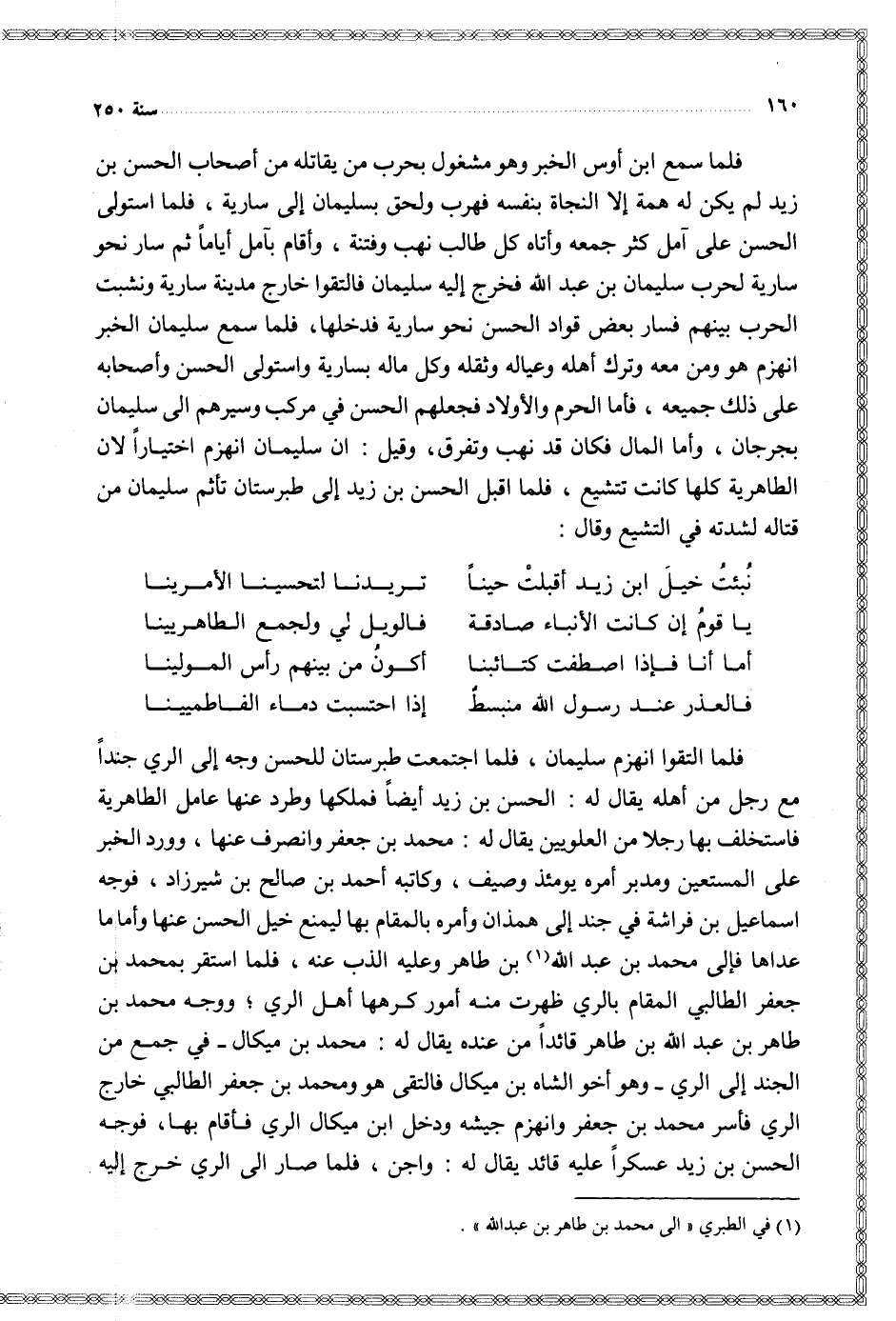 فلما التقوا انهزم سليمان فلما اجتمعت طبرستان للحسن وجه إلى الري جندا مع رجل من أهله يقال له الحسن بن زيد أيضا فملكها وطرد عنها عامل الطاهرية فاستخلف بها رجلا من العلويين يقال له محمد بن جعفر وانصرف عنها وورد الخبر على المستعين ومدبر أمره يومئذ وصيف وكاتبه أحمد بن صالح بن شيرزاد فوجه إسماعيل بن فراشة في جند إلى همذان وأمره بالمقام بها ليمنع خيل الحسن عنها وأما ما هداها فإلى محمد بن عبد الله بن طاهر وعليه الذب عنه فلما استقر بمحمد بن جعفر الطالبي المقام بالري ظهرت منه أمور كرهها أهل الري ووجه محمد بن طاهر بن عبد الله بن طاهر قائدا من عنده يقال له محمد بن ميكال في جمع من الجند إلى الري وهو أخو الشاه بن ميكال فالتقى هو ومحمد بن جعفر الطالبي خارج الري فأسر محمد بن جعفر وانهزم جيشه ودخل ابن ميكال الري فأقام بها فوجه الحسن بن زيد عسكرا عليه قائد يقال له واجن فلما صار إلى الري خرج إليه
