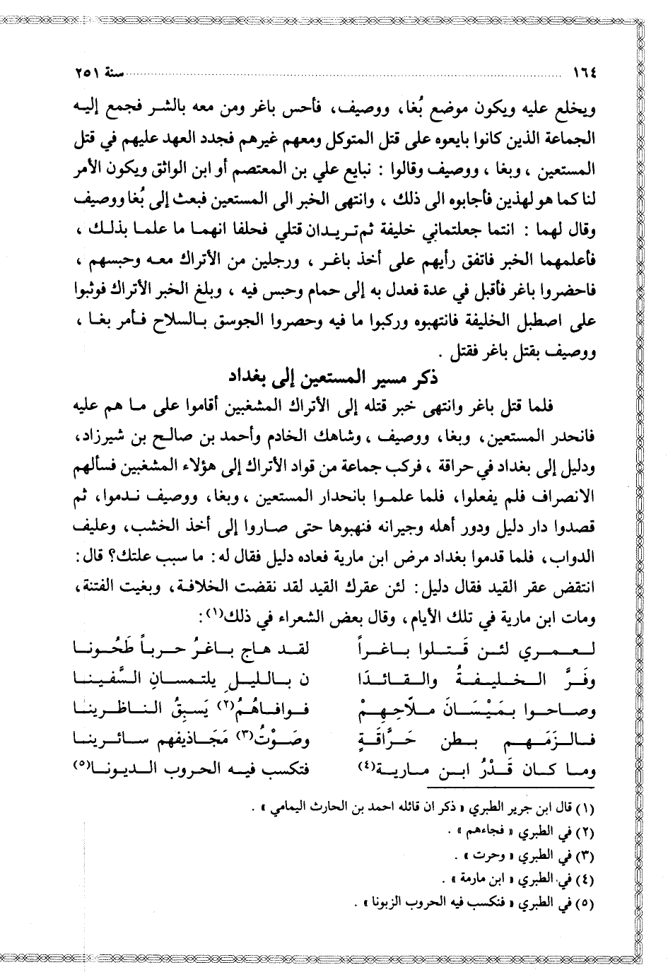 ويخلع عليه ويكون موضع بغا ووصيف فأحس باغر ومن معه الشر فجمع إليه الجماعة الذين كانوا بايعوه على قتل المتوكل ومعهم غيرهم فجدد العهد عليهم في قتل المستعين وبغا ووصيف وقالوا نبايع علي بن المعتصم أو ابن الواثق ويكون الأمر لنا كما هو لهذين فأجابوه إلى ذلك وانتهى الخبر إلى المستعين فبعث إلى بغا ووصيف وقال لهما أنتما جعلتماني خليفة ثم تريدان قتلي فحلفا أنهما ما علما بذلك فأعلمهما الخبر فاتفق رأيهم على أخذ باغر ورجلين من الأتراك معه وحبسهم فأحضروا باغر فأقبل في عدة فعدل به إلى حمام وحبس فيه وبلغ الخبر الأتراك فوثبوا على اصطبل الخليفة فانتهبوه وركبوا ما فيه وحصروا الجوسق بالسلاح فأمر بغا ووصيف بقتل باغر فقتل