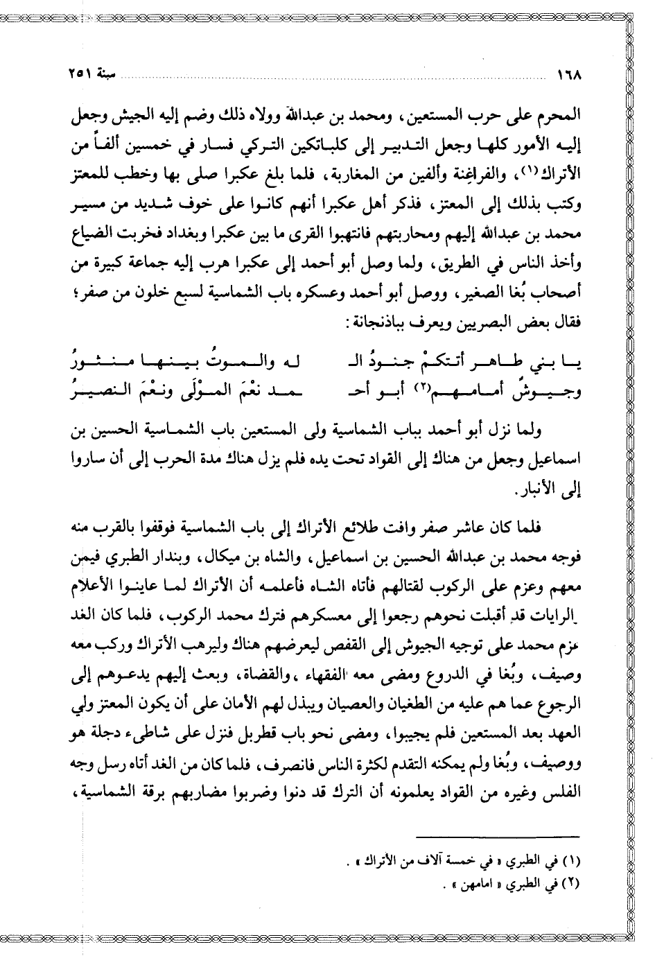 المحرم على حرب المستعين ومحمد بن عبد الله وولاه ذلك وضم إليه الجيش وجعل إليه الأمور كلها وجعل التدبير إلى كلباتكين فسار في خمسين ألفا من الأتراك والفراغنة وألفين من المغاربة فلما بلغ عكبرا صلى بها وخطب للمعتز وكتب بذلك إلى المعتز فذكر أهل عكبرا أنهم كانوا على خوف شديد من مسير محمد بن عبد الله إليهم ومحاربتهم فانتهبوا القرى ما بين عكبرا وبغداد فخربت الضياع وأخذ الناس في الطريق ولما وصل أبو أحمد إلى عكبرا هرب إليه جماعة كبيرة من أصحاب بغا الصغير ووصل أبو أحمد وعسكره باب الشماسية لسبع خلون من صفر فقال بعض البصريين ويعرف بباذنجانة